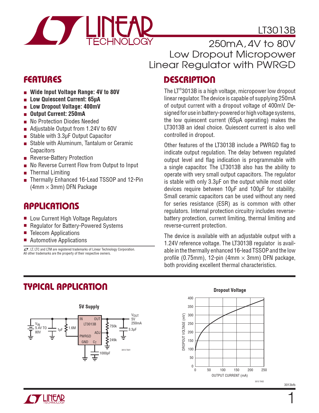 350 VOUT 300 IN OUT 5V VIN 250mA LT3013B 250 750k 5.4V TO 1μF 1.6M 3.3μF TAGE (mV) 80V ADJ 200 PWRGD 249k GND C 150 T 3013 TA01 DROPOUT VOL 100 1000pF 50 0 0 50 100 150 200 250 OUTPUT CURRENT (mA) 3013 TA02 3013bfb 1