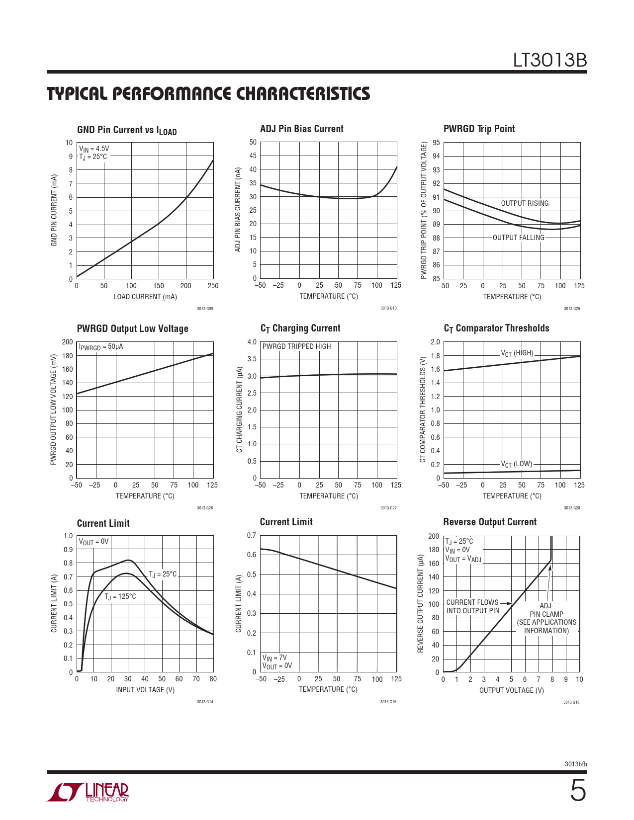 10 50 95 VIN = 4.5V 9 TJ = 25°C 45 94 8 40 93 7 35 92 6 30 91 OUTPUT RISING 5 25 90 4 20 89 3 15 88 OUTPUT FALLING GND PIN CURRENT (mA) 2 ADJ PIN BIAS CURRENT (nA) 10 87 1 5 86 0 0 PWRGD TRIP POINT (% OF OUTPUT VOLTAGE) 85 0 50 100 150 200 250 –50 –25 0 25 50 75 100 125 –50 –25 0 25 50 75 100 125 LOAD CURRENT (mA) TEMPERATURE (°C) TEMPERATURE (°C) 3013 G09 3013 G13 3013 G25