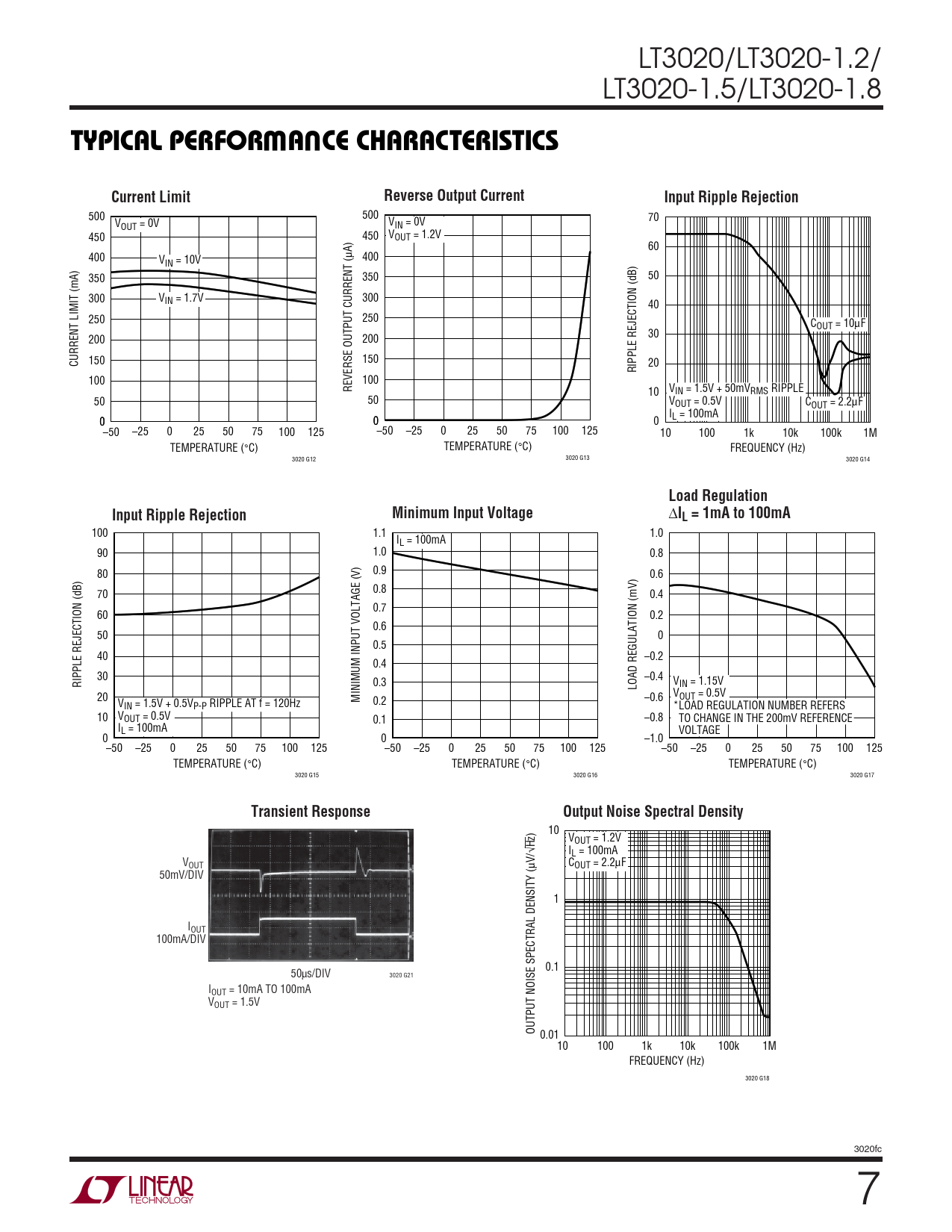 10 VOUT = 1.2V √Hz) IL = 100mA VOUT µV/ COUT = 2.2µF 50mV/DIV 1 IOUT 100mA/DIV 0.1 50µs/DIV 3020 G21 IOUT = 10mA TO 100mA VOUT = 1.5V OUTPUT NOISE SPECTRAL DENSITY ( 0.01 10 100 1k 10k 100k 1M FREQUENCY (Hz) 3020 G18 3020fc 7