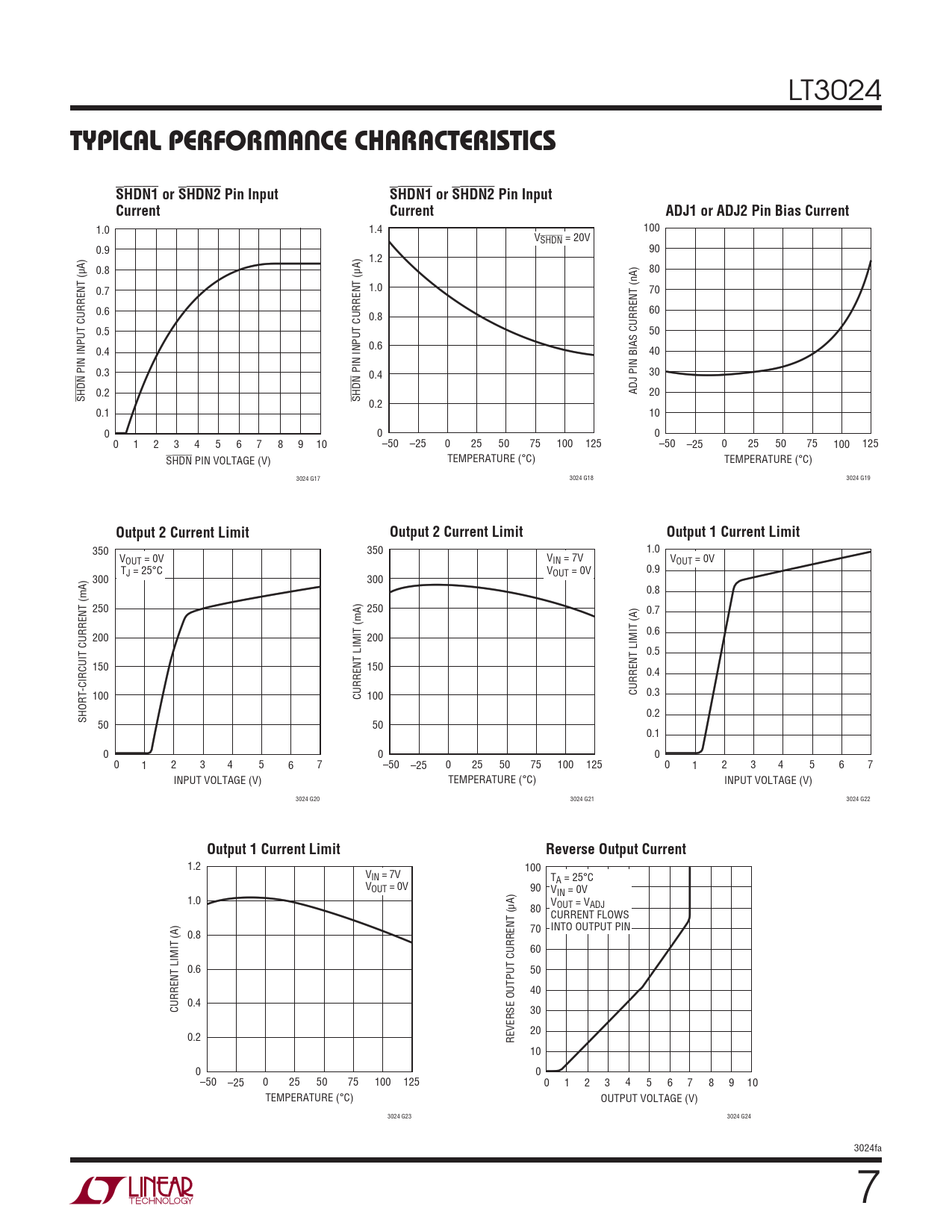 350 350 1.0 VOUT = 0V VIN = 7V VOUT = 0V TJ = 25°C VOUT = 0V 0.9 300 300 0.8 250 250 0.7 0.6 200 200 0.5 150 150 0.4 100 CURRENT LIMIT (mA) 100 CURRENT LIMIT (A) 0.3 0.2 SHORT-CIRCUIT CURRENT (mA) 50 50 0.1 0 0 0 0 1 2 3 4 5 6 7 –50 –25 0 25 50 75 100 125 0 1 2 3 4 5 6 7 INPUT VOLTAGE (V) TEMPERATURE (°C) INPUT VOLTAGE (V) 3024 G20 3024 G21 3024 G22