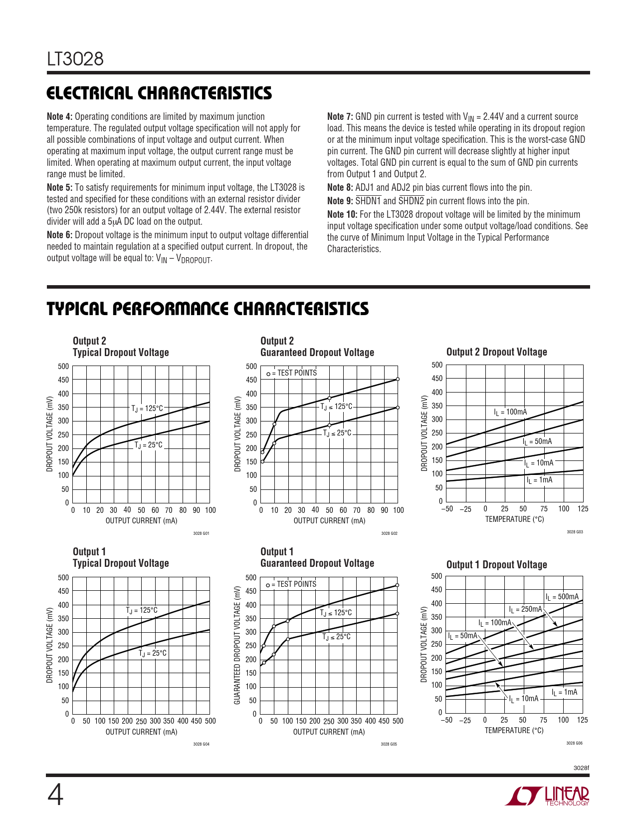 LT3028 ELECTRICAL CHARACTERISTICSNote 4: Operating conditions are limited by maximum junction Note 7: GND pin current is tested with VIN = 2.44V and a current source temperature. The regulated output voltage specification will not apply for load. This means the device is tested while operating in its dropout region all possible combinations of input voltage and output current. When or at the minimum input voltage specification. This is the worst-case GND operating at maximum input voltage, the output current range must be pin current. The GND pin current will decrease slightly at higher input limited. When operating at maximum output current, the input voltage voltages. Total GND pin current is equal to the sum of GND pin currents range must be limited. from Output 1 and Output 2. Note 5: To satisfy requirements for minimum input voltage, the LT3028 is Note 8: ADJ1 and ADJ2 pin bias current flows into the pin. tested and specified for these conditions with an external resistor divider Note 9: SHDN1 and SHDN2 pin current flows into the pin. (two 250k resistors) for an output voltage of 2.44V. The external resistor Note 10: For the LT3028 dropout voltage will be limited by the minimum divider will add a 5µA DC load on the output. input voltage specification under some output voltage/load conditions. See Note 6: Dropout voltage is the minimum input to output voltage differential the curve of Minimum Input Voltage in the Typical Performance needed to maintain regulation at a specified output current. In dropout, the Characteristics. output voltage will be equal to: VIN – VDROPOUT. WUTYPICAL PERFOR A CE CHARACTERISTICSOutput 2Output 2Typical Dropout VoltageGuaranteed Dropout VoltageOutput 2 Dropout Voltage 500 500 500 = TEST POINTS 450 450 450 400 400 400 350 T T 350 J = 125°C 350 J ≤ 125°C IL = 100mA 300 300 300 250 250 TJ ≤ 25°C 250 IL = 50mA 200 TJ = 25°C 200 200 150 150 150 IL = 10mA DROPOUT VOLTAGE (mV) DROPOUT VOLTAGE (mV) DROPOUT VOLTAGE (mV) 100 100 100 IL = 1mA 50 50 50 0 0 0 0 10 20 30 40 50 60 70 80 90 100 0 10 20 30 40 50 60 70 80 90 100 –50 –25 0 25 50 75 100 125 OUTPUT CURRENT (mA) OUTPUT CURRENT (mA) TEMPERATURE (°C) 3028 G01 3028 G02 3028 G03 Output 1Output 1Typical Dropout VoltageGuaranteed Dropout VoltageOutput 1 Dropout Voltage 500 500 500 = TEST POINTS 450 450 450 IL = 500mA 400 400 400 T I J = 125°C T L = 250mA J ≤ 125°C 350 350 350 IL = 100mA 300 300 300 T I J ≤ 25°C L = 50mA 250 250 250 TJ = 25°C 200 200 200 150 150 150 DROPOUT VOLTAGE (mV) DROPOUT VOLTAGE (mV) 100 100 100 IL = 1mA 50 50 I GUARANTEED DROPOUT VOLTAGE (mV) 50 L = 10mA 0 0 0 0 50 100 150 200 250 300 350 400 450 500 0 50 100 150 200 250 300 350 400 450 500 –50 –25 0 25 50 75 100 125 OUTPUT CURRENT (mA) OUTPUT CURRENT (mA) TEMPERATURE (°C) 3028 G04 3028 G05 3028 G06 3028f 4