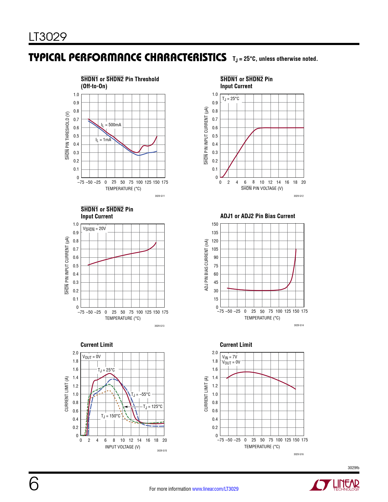 1.0 150 VSHDN = 20V 0.9 135 0.8 120 0.7 105 0.6 90 0.5 75 0.4 60 PIN INPUT CURRENT (µA) 0.3 45 ADJ PIN BIAS CURRENT (nA) SHDN 0.2 30 0.1 15 0 0 –75 –50 –25 0 25 50 75 100 125 150 175 –75 –50 –25 0 25 50 75 100 125 150 175 TEMPERATURE (°C) TEMPERATURE (°C) 3029 G13 3029 G14