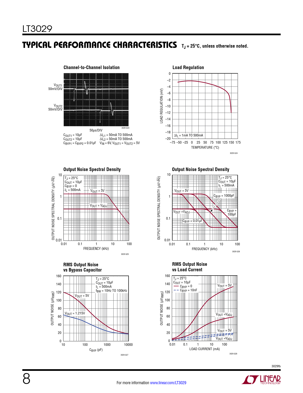 0 –2 VOUT1 –4 50mV/DIV –6 –8 TION (mV) VOUT2 –10 50mV/DIV –12 –14 LOAD REGULA –16 3029 G23 50µs/DIV –18 COUT1 = 10µF ∆IL1 = 50mA TO 500mA ∆IL = 1mA TO 500mA C ∆I –20 OUT2 = 10µF L2 = 50mA TO 500mA C V –75 –50 –25 0 25 50 75 100 125 150 175 BYP1 = CBYP2 = 0.01µF IN = 6V, VOUT1 = VOUT2 = 5V TEMPERATURE (°C) 3029 G24