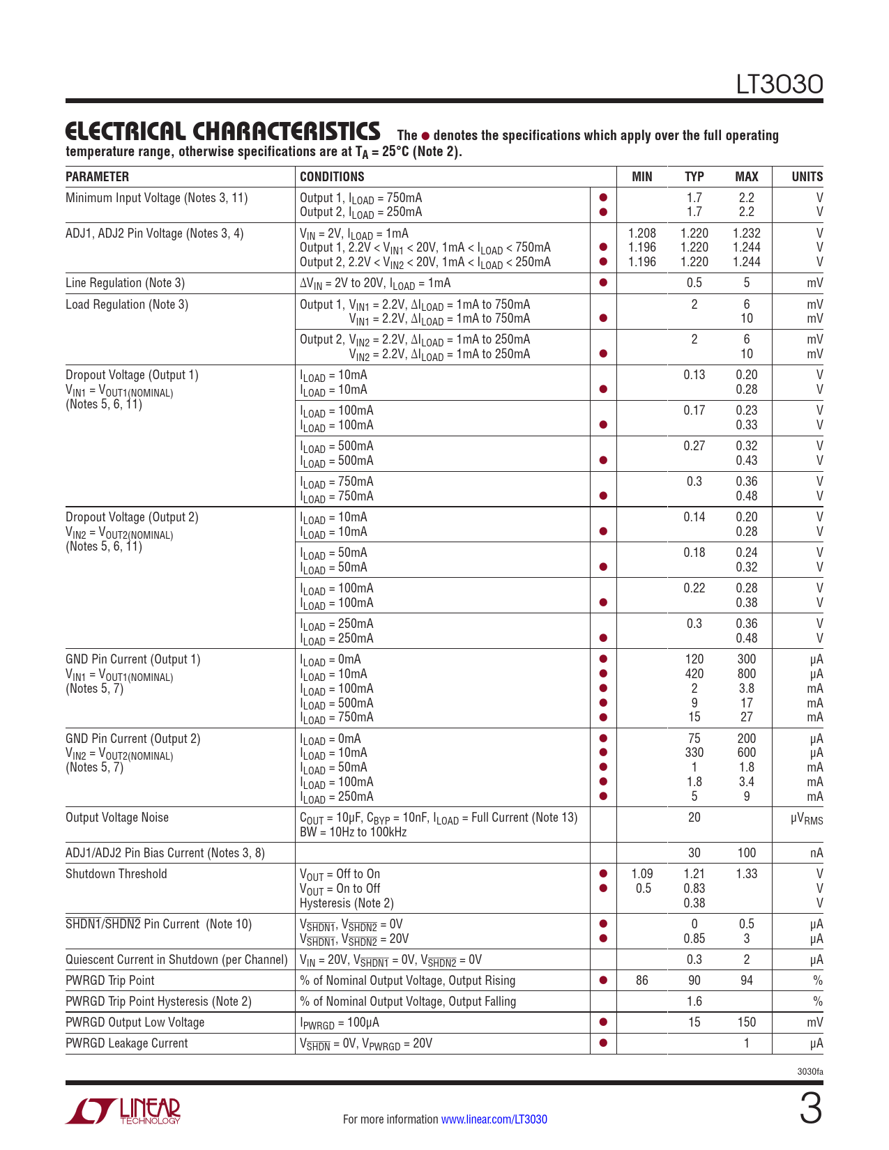 Minimum Input Voltage (Notes 3, 11) Output 1, ILOAD = 750mA l 1.7 2.2 V Output 2, ILOAD = 250mA l 1.7 2.2 V ADJ1, ADJ2 Pin Voltage (Notes 3, 4) VIN = 2V, ILOAD = 1mA 1.208 1.220 1.232 V Output 1, 2.2V < VIN1 < 20V, 1mA < ILOAD < 750mA l 1.196 1.220 1.244 V Output 2, 2.2V < VIN2 < 20V, 1mA < ILOAD < 250mA l 1.196 1.220 1.244 V Line Regulation (Note 3) ∆VIN = 2V to 20V, ILOAD = 1mA l 0.5 5 mV Load Regulation (Note 3) Output 1, VIN1 = 2.2V, ∆ILOAD = 1mA to 750mA 2 6 mV VIN1 = 2.2V, ∆ILOAD = 1mA to 750mA l 10 mV Output 2, VIN2 = 2.2V, ∆ILOAD = 1mA to 250mA 2 6 mV VIN2 = 2.2V, ∆ILOAD = 1mA to 250mA l 10 mV Dropout Voltage (Output 1) ILOAD = 10mA 0.13 0.20 V VIN1 = VOUT1(NOMINAL) ILOAD = 10mA l 0.28 V (Notes 5, 6, 11) ILOAD = 100mA 0.17 0.23 V ILOAD = 100mA l 0.33 V ILOAD = 500mA 0.27 0.32 V ILOAD = 500mA l 0.43 V ILOAD = 750mA 0.3 0.36 V ILOAD = 750mA l 0.48 V Dropout Voltage (Output 2) ILOAD = 10mA 0.14 0.20 V VIN2 = VOUT2(NOMINAL) ILOAD = 10mA l 0.28 V (Notes 5, 6, 11) ILOAD = 50mA 0.18 0.24 V ILOAD = 50mA l 0.32 V ILOAD = 100mA 0.22 0.28 V ILOAD = 100mA l 0.38 V ILOAD = 250mA 0.3 0.36 V ILOAD = 250mA l 0.48 V GND Pin Current (Output 1) ILOAD = 0mA l 120 300 μA VIN1 = VOUT1(NOMINAL) ILOAD = 10mA l 420 800 μA (Notes 5, 7) ILOAD = 100mA l 2 3.8 mA ILOAD = 500mA l 9 17 mA ILOAD = 750mA l 15 27 mA GND Pin Current (Output 2) ILOAD = 0mA l 75 200 μA VIN2 = VOUT2(NOMINAL) ILOAD = 10mA l 330 600 μA (Notes 5, 7) ILOAD = 50mA l 1 1.8 mA ILOAD = 100mA l 1.8 3.4 mA ILOAD = 250mA l 5 9 mA Output Voltage Noise COUT = 10μF, CBYP = 10nF, ILOAD = Full Current (Note 13) 20 μVRMS BW = 10Hz to 100kHz ADJ1/ADJ2 Pin Bias Current (Notes 3, 8) 30 100 nA Shutdown Threshold VOUT = Off to On l 1.09 1.21 1.33 V VOUT = On to Off l 0.5 0.83 V Hysteresis (Note 2) 0.38 V SHDN1/SHDN2 Pin Current (Note 10) VSHDN1, VSHDN2 = 0V l 0 0.5 μA VSHDN1, VSHDN2 = 20V l 0.85 3 μA Quiescent Current in Shutdown (per Channel) VIN = 20V, VSHDN1 = 0V, VSHDN2 = 0V 0.3 2 μA PWRGD Trip Point % of Nominal Output Voltage, Output Rising l 86 90 94 % PWRGD Trip Point Hysteresis (Note 2) % of Nominal Output Voltage, Output Falling 1.6 % PWRGD Output Low Voltage IPWRGD = 100μA l 15 150 mV PWRGD Leakage Current VSHDN = 0V, VPWRGD = 20V l 1 μA 3030fa For more information www.linear.com/LT3030 3 Document Outline Features Description Applications Typical Application Absolute Maximum Ratings Pin Configuration Order Information Electrical Characteristics Typical Performance Characteristics Pin Functions Applications Information Typical Applications Package Description Revision History Typical Application Related Parts