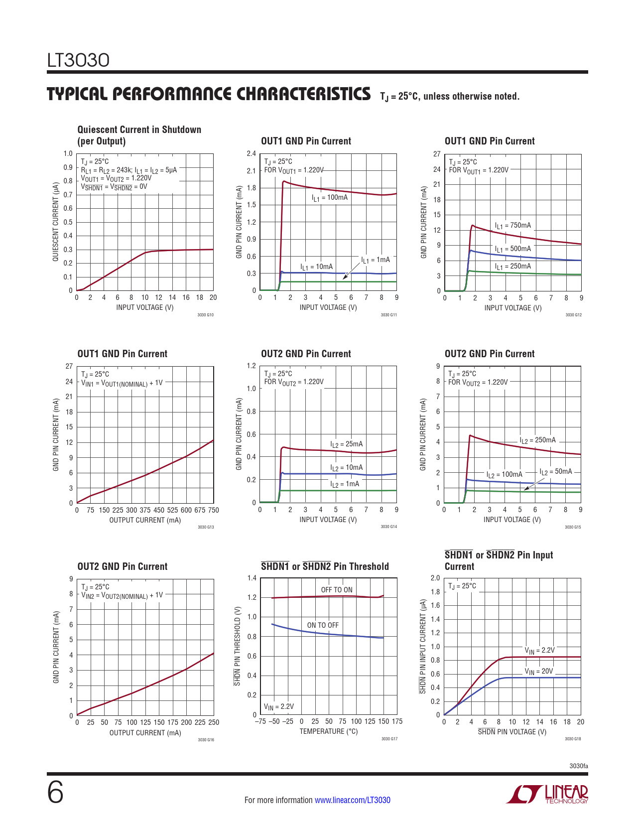 27 1.2 9 TJ = 25°C TJ = 25°C TJ = 25°C 24 VIN1 = VOUT1(NOMINAL) + 1V FOR V 8 OUT2 = 1.220V FOR VOUT2 = 1.220V 1.0 21 7 18 0.8 6 15 5 0.6 12 I 4 IL2 = 250mA L2 = 25mA 9 0.4 3 GND PIN CURRENT (mA) GND PIN CURRENT (mA) IL2 = 10mA GND PIN CURRENT (mA) 6 2 IL2 = 100mA IL2 = 50mA 0.2 3 IL2 = 1mA 1 0 0 0 0 75 150 225 300 375 450 525 600 675 750 0 1 2 3 4 5 6 7 8 9 0 1 2 3 4 5 6 7 8 9 OUTPUT CURRENT (mA) INPUT VOLTAGE (V) INPUT VOLTAGE (V) 3030 G13 3030 G14 3030 G15