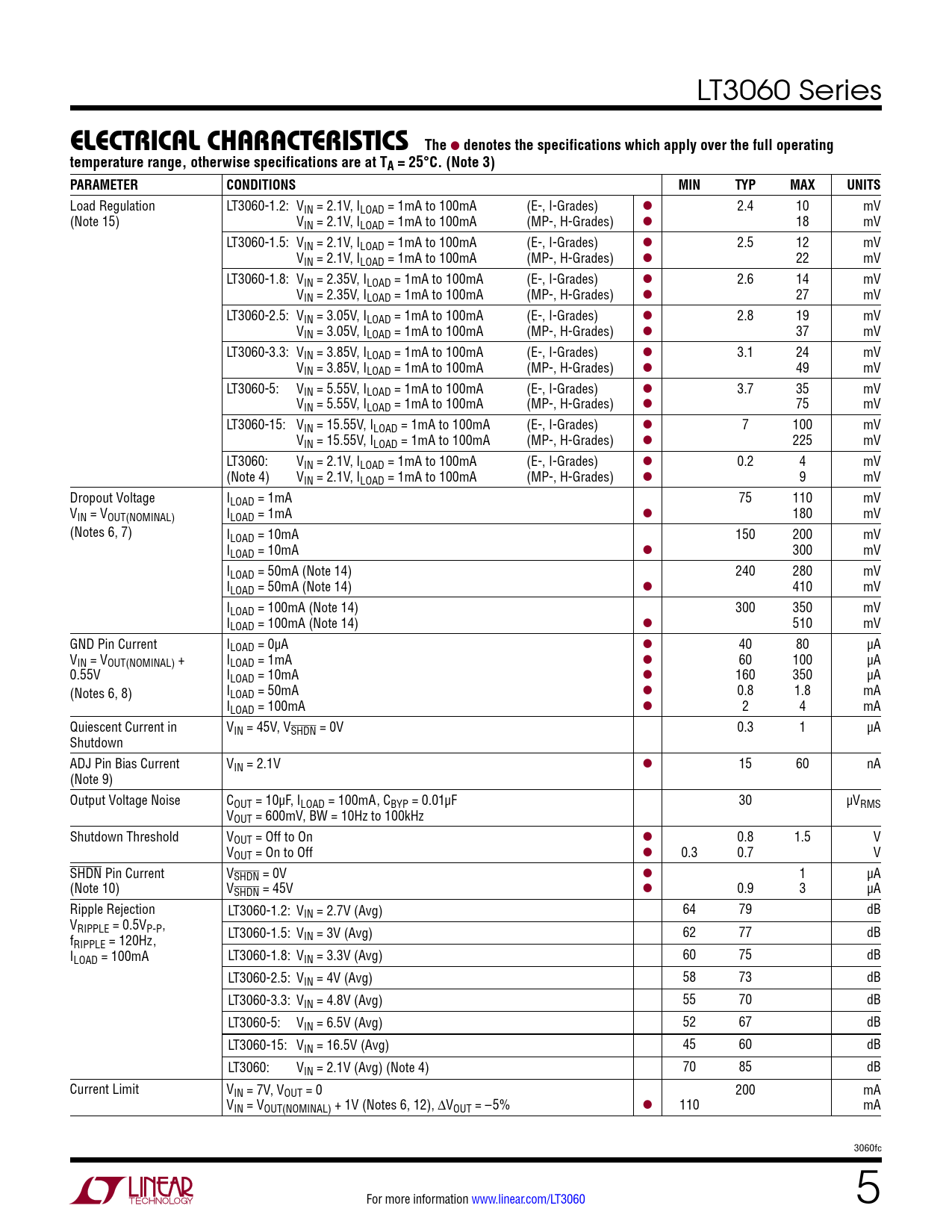 Load Regulation LT3060-1.2: VIN = 2.1V, ILOAD = 1mA to 100mA (E-, I-Grades) l 2.4 10 mV (Note 15) VIN = 2.1V, ILOAD = 1mA to 100mA (MP-, H-Grades) l 18 mV LT3060-1.5: VIN = 2.1V, ILOAD = 1mA to 100mA (E-, I-Grades) l 2.5 12 mV VIN = 2.1V, ILOAD = 1mA to 100mA (MP-, H-Grades) l 22 mV LT3060-1.8: VIN = 2.35V, ILOAD = 1mA to 100mA (E-, I-Grades) l 2.6 14 mV VIN = 2.35V, ILOAD = 1mA to 100mA (MP-, H-Grades) l 27 mV LT3060-2.5: VIN = 3.05V, ILOAD = 1mA to 100mA (E-, I-Grades) l 2.8 19 mV VIN = 3.05V, ILOAD = 1mA to 100mA (MP-, H-Grades) l 37 mV LT3060-3.3: VIN = 3.85V, ILOAD = 1mA to 100mA (E-, I-Grades) l 3.1 24 mV VIN = 3.85V, ILOAD = 1mA to 100mA (MP-, H-Grades) l 49 mV LT3060-5: VIN = 5.55V, ILOAD = 1mA to 100mA (E-, I-Grades) l 3.7 35 mV VIN = 5.55V, ILOAD = 1mA to 100mA (MP-, H-Grades) l 75 mV LT3060-15: VIN = 15.55V, ILOAD = 1mA to 100mA (E-, I-Grades) l 7 100 mV VIN = 15.55V, ILOAD = 1mA to 100mA (MP-, H-Grades) l 225 mV LT3060: VIN = 2.1V, ILOAD = 1mA to 100mA (E-, I-Grades) l 0.2 4 mV (Note 4) VIN = 2.1V, ILOAD = 1mA to 100mA (MP-, H-Grades) l 9 mV Dropout Voltage ILOAD = 1mA 75 110 mV VIN = VOUT(NOMINAL) ILOAD = 1mA l 180 mV (Notes 6, 7) ILOAD = 10mA 150 200 mV ILOAD = 10mA l 300 mV ILOAD = 50mA (Note 14) 240 280 mV ILOAD = 50mA (Note 14) l 410 mV ILOAD = 100mA (Note 14) 300 350 mV ILOAD = 100mA (Note 14) l 510 mV GND Pin Current ILOAD = 0µA l 40 80 µA VIN = VOUT(NOMINAL) + ILOAD = 1mA l 60 100 µA 0.55V ILOAD = 10mA l 160 350 µA (Notes 6, 8) ILOAD = 50mA l 0.8 1.8 mA ILOAD = 100mA l 2 4 mA Quiescent Current in VIN = 45V, VSHDN = 0V 0.3 1 µA Shutdown ADJ Pin Bias Current VIN = 2.1V l 15 60 nA (Note 9) Output Voltage Noise COUT = 10µF, ILOAD = 100mA, CBYP = 0.01µF 30 µVRMS VOUT = 600mV, BW = 10Hz to 100kHz Shutdown Threshold VOUT = Off to On l 0.8 1.5 V VOUT = On to Off l 0.3 0.7 V SHDN Pin Current VSHDN = 0V l 1 µA (Note 10) VSHDN = 45V l 0.9 3 µA Ripple Rejection LT3060-1.2: VIN = 2.7V (Avg) 64 79 dB VRIPPLE = 0.5VP-P, f LT3060-1.5: VIN = 3V (Avg) 62 77 dB RIPPLE = 120Hz, ILOAD = 100mA LT3060-1.8: VIN = 3.3V (Avg) 60 75 dB LT3060-2.5: VIN = 4V (Avg) 58 73 dB LT3060-3.3: VIN = 4.8V (Avg) 55 70 dB LT3060-5: VIN = 6.5V (Avg) 52 67 dB LT3060-15: VIN = 16.5V (Avg) 45 60 dB LT3060: VIN = 2.1V (Avg) (Note 4) 70 85 dB Current Limit VIN = 7V, VOUT = 0 200 mA VIN = VOUT(NOMINAL) + 1V (Notes 6, 12), ΔVOUT = –5% l 110 mA 3060fc For more information www.linear.com/LT3060 5 Document Outline Features Applications Description Typical Application Absolute Maximum Ratings Pin Configuration Order Information Electrical Characteristics Typical Performance Characteristics Pin Functions Applications Information Typical Application Revision History Typical Application Related Parts