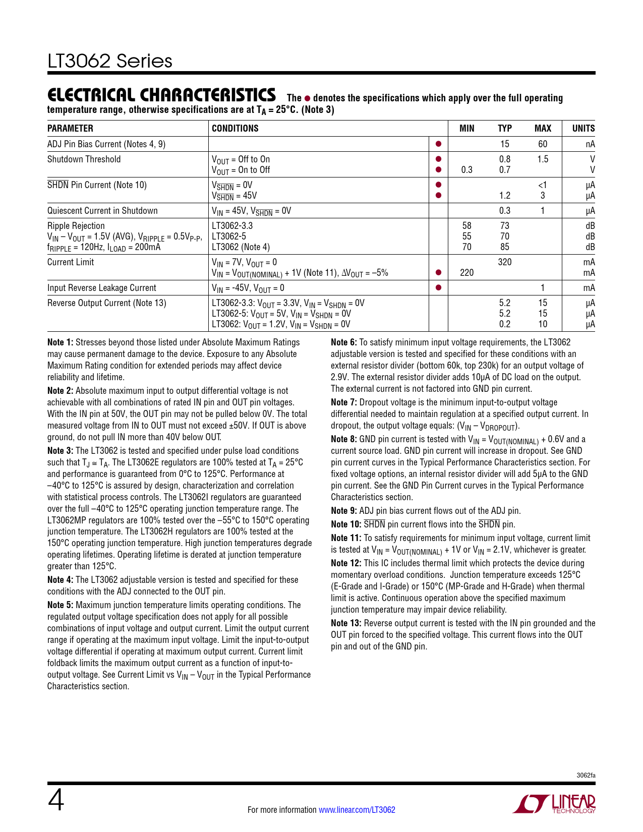 LT3062 Series elecTrical characTerisTics The l denotes the specifications which apply over the full operatingtemperature range, otherwise specifications are at TA = 25°C. (Note 3) PARAMETERCONDITIONSMINTYPMAXUNITS ADJ Pin Bias Current (Notes 4, 9) l 15 60 nA Shutdown Threshold VOUT = Off to On l 0.8 1.5 V VOUT = On to Off l 0.3 0.7 V SHDN Pin Current (Note 10) VSHDN = 0V l <1 µA VSHDN = 45V l 1.2 3 µA Quiescent Current in Shutdown VIN = 45V, VSHDN = 0V 0.3 1 µA Ripple Rejection LT3062-3.3 58 73 dB VIN – VOUT = 1.5V (AVG), VRIPPLE = 0.5VP-P, LT3062-5 55 70 dB fRIPPLE = 120Hz, ILOAD = 200mA LT3062 (Note 4) 70 85 dB Current Limit VIN = 7V, VOUT = 0 320 mA VIN = VOUT(NOMINAL) + 1V (Note 11), ΔVOUT = –5% l 220 mA Input Reverse Leakage Current VIN = -45V, VOUT = 0 l 1 mA Reverse Output Current (Note 13) LT3062-3.3: VOUT = 3.3V, VIN = VSHDN = 0V 5.2 15 µA LT3062-5: VOUT = 5V, VIN = VSHDN = 0V 5.2 15 µA LT3062: VOUT = 1.2V, VIN = VSHDN = 0V 0.2 10 µA Note 1: Stresses beyond those listed under Absolute Maximum Ratings Note 6: To satisfy minimum input voltage requirements, the LT3062 may cause permanent damage to the device. Exposure to any Absolute adjustable version is tested and specified for these conditions with an Maximum Rating condition for extended periods may affect device external resistor divider (bottom 60k, top 230k) for an output voltage of reliability and lifetime. 2.9V. The external resistor divider adds 10µA of DC load on the output. Note 2: Absolute maximum input to output differential voltage is not The external current is not factored into GND pin current. achievable with all combinations of rated IN pin and OUT pin voltages. Note 7: Dropout voltage is the minimum input-to-output voltage With the IN pin at 50V, the OUT pin may not be pulled below 0V. The total differential needed to maintain regulation at a specified output current. In measured voltage from IN to OUT must not exceed ±50V. If OUT is above dropout, the output voltage equals: (VIN – VDROPOUT). ground, do not pull IN more than 40V below OUT. Note 8: GND pin current is tested with VIN = VOUT(NOMINAL) + 0.6V and a Note 3: The LT3062 is tested and specified under pulse load conditions current source load. GND pin current will increase in dropout. See GND such that TJ ≅ TA. The LT3062E regulators are 100% tested at TA = 25°C pin current curves in the Typical Performance Characteristics section. For and performance is guaranteed from 0°C to 125°C. Performance at fixed voltage options, an internal resistor divider will add 5μA to the GND –40°C to 125°C is assured by design, characterization and correlation pin current. See the GND Pin Current curves in the Typical Performance with statistical process controls. The LT3062I regulators are guaranteed Characteristics section. over the full –40°C to 125°C operating junction temperature range. The Note 9: ADJ pin bias current flows out of the ADJ pin. LT3062MP regulators are 100% tested over the –55°C to 150°C operating Note 10: SHDN pin current flows into the SHDN pin. junction temperature. The LT3062H regulators are 100% tested at the 150°C operating junction temperature. High junction temperatures degrade Note 11: To satisfy requirements for minimum input voltage, current limit operating lifetimes. Operating lifetime is derated at junction temperature is tested at VIN = VOUT(NOMINAL) + 1V or VIN = 2.1V, whichever is greater. greater than 125°C. Note 12: This IC includes thermal limit which protects the device during Note 4: The LT3062 adjustable version is tested and specified for these momentary overload conditions. Junction temperature exceeds 125°C conditions with the ADJ connected to the OUT pin. (E-Grade and I-Grade) or 150°C (MP-Grade and H-Grade) when thermal limit is active. Continuous operation above the specified maximum Note 5: Maximum junction temperature limits operating conditions. The junction temperature may impair device reliability. regulated output voltage specification does not apply for all possible combinations of input voltage and output current. Limit the output current Note 13: Reverse output current is tested with the IN pin grounded and the range if operating at the maximum input voltage. Limit the input-to-output OUT pin forced to the specified voltage. This current flows into the OUT voltage differential if operating at maximum output current. Current limit pin and out of the GND pin. foldback limits the maximum output current as a function of input-to- output voltage. See Current Limit vs VIN – VOUT in the Typical Performance Characteristics section. 3062fa 4 For more information www.linear.com/LT3062