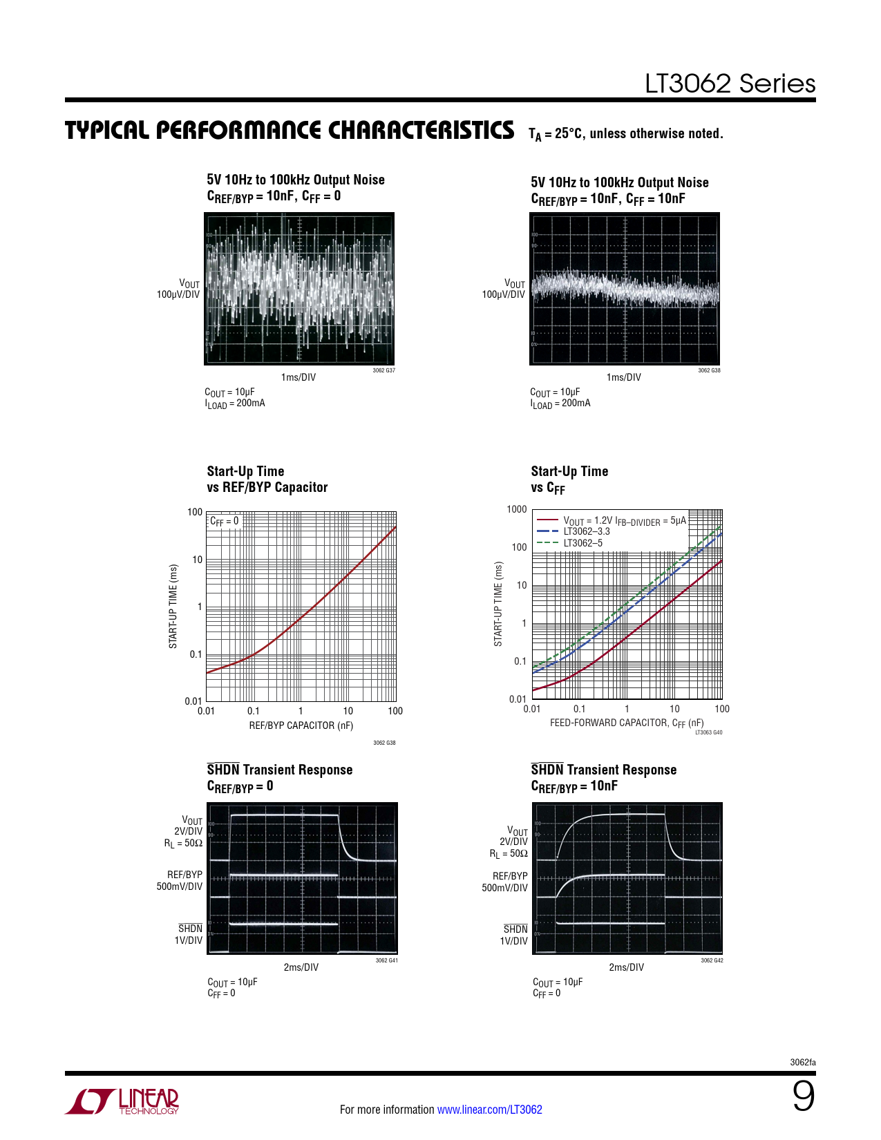 VOUT 2V/DIV VOUT RL = 50Ω 2V/DIV RL = 50Ω REF/BYP REF/BYP 500mV/DIV 500mV/DIV SHDN SHDN 1V/DIV 1V/DIV 3062 G41 3062 G42 2ms/DIV 2ms/DIV COUT = 10µF COUT = 10µF CFF = 0 CFF = 0 3062fa For more information www.linear.com/LT3062 9