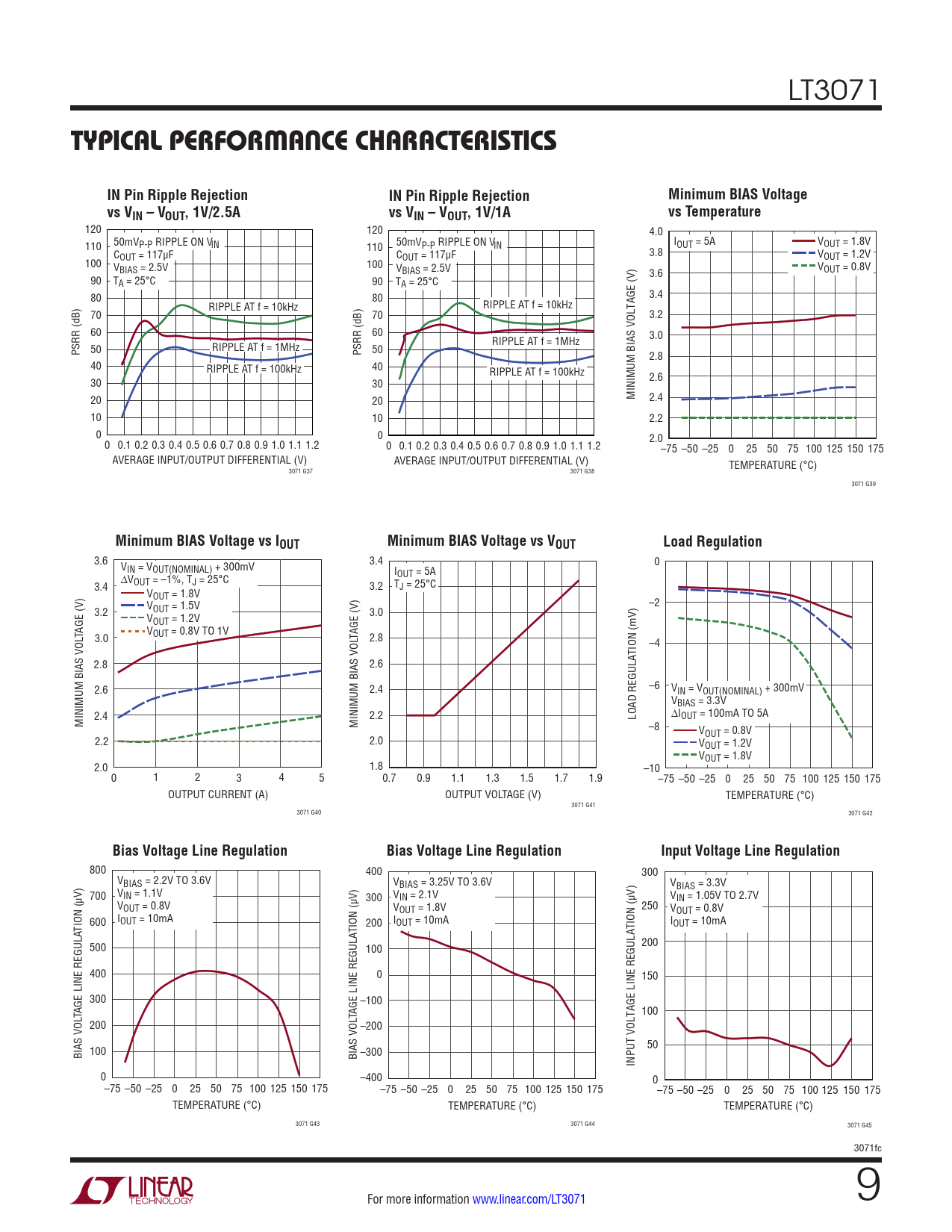 3.6 V 3.4 0 IN = VOUT(NOMINAL) + 300mV I ∆V OUT = 5A 3.4 OUT = –1%, TJ = 25°C 3.2 T V J = 25°C OUT = 1.8V –2 3.2 VOUT = 1.5V V 3.0 OUT = 1.2V TAGE (V) V 3.0 OUT = 0.8V TO 1V TAGE (V) 2.8 –4 2.8 2.6 2.6 2.4 –6 VIN = VOUT(NOMINAL) + 300mV VBIAS = 3.3V 2.4 2.2 LOAD REGULATION (mV) ∆IOUT = 100mA TO 5A MINIMUM BIAS VOL MINIMUM BIAS VOL –8 VOUT = 0.8V 2.2 2.0 VOUT = 1.2V VOUT = 1.8V 2.0 1.8 –10 0 1 2 3 4 5 0.7 0.9 1.1 1.3 1.5 1.7 1.9 –75 –50 –25 0 25 50 75 100 125 150 175 OUTPUT CURRENT (A) OUTPUT VOLTAGE (V) TEMPERATURE (°C) 3071 G41 3071 G40 3071 G42
