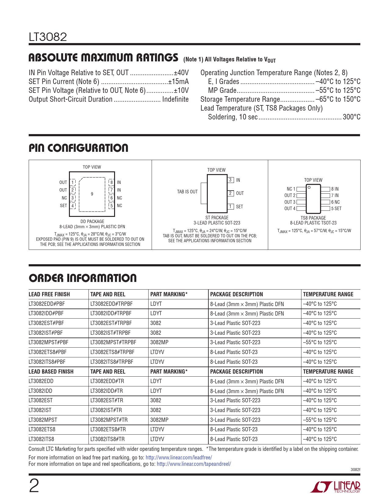 LT3082 ABSOLUTE MAXIMUM RATINGS (Note 1) All Voltages Relative to VOUT IN Pin Voltage Relative to SET, OUT ..±40V Operating Junction Temperature Range (Notes 2, 8) SET Pin Current (Note 6) ...±15mA E, I Grades ... –40°C to 125°C SET Pin Voltage (Relative to OUT, Note 6) ...±10V MP Grade ... –55°C to 125°C Output Short-Circuit Duration .. Indefi nite Storage Temperature Range ... –65°C to 150°C Lead Temperature (ST, TS8 Packages Only) Soldering, 10 sec .. 300°C PIN CONFIGURATION TOP VIEW TOP VIEW 3 IN OUT 1 8 IN TOP VIEW OUT 2 7 IN NC 1 8 IN 9 TAB IS OUT 2 OUT OUT 2 7 IN NC 3 6 NC OUT 3 6 NC SET 4 5 NC 1 SET OUT 4 5 SET ST PACKAGE TS8 PACKAGE DD PACKAGE 3-LEAD PLASTIC SOT-223 8-LEAD PLASTIC TSOT-23 8-LEAD (3mm s 3mm) PLASTIC DFN TJMAX = 125°C, θJA = 24°C/W, θJC = 15°C/W TJMAX = 125°C, θJA = 57°C/W, θJC = 15°C/W TJMAX = 125°C, θJA = 28°C/W, θJC = 3°C/W TAB IS OUT, MUST BE SOLDERED TO OUT ON THE PCB; EXPOSED PAD (PIN 9) IS OUT, MUST BE SOLDERED TO OUT ON SEE THE APPLICATIONS INFORMATION SECTION THE PCB; SEE THE APPLICATIONS INFORMATION SECTION ORDER INFORMATIONLEAD FREE FINISHTAPE AND REELPART MARKING*PACKAGE DESCRIPTIONTEMPERATURE RANGE LT3082EDD#PBF LT3082EDD#TRPBF LDYT 8-Lead (3mm × 3mm) Plastic DFN –40°C to 125°C LT3082IDD#PBF LT3082IDD#TRPBF LDYT 8-Lead (3mm × 3mm) Plastic DFN –40°C to 125°C LT3082EST#PBF LT3082EST#TRPBF 3082 3-Lead Plastic SOT-223 –40°C to 125°C LT3082IST#PBF LT3082IST#TRPBF 3082 3-Lead Plastic SOT-223 –40°C to 125°C LT3082MPST#PBF LT3082MPST#TRPBF 3082MP 3-Lead Plastic SOT-223 –55°C to 125°C LT3082ETS8#PBF LT3082ETS8#TRPBF LTDYV 8-Lead Plastic SOT-23 –40°C to 125°C LT3082ITS8#PBF LT3082ITS8#TRPBF LTDYV 8-Lead Plastic SOT-23 –40°C to 125°C LEAD BASED FINISHTAPE AND REELPART MARKING*PACKAGE DESCRIPTIONTEMPERATURE RANGE LT3082EDD LT3082EDD#TR LDYT 8-Lead (3mm × 3mm) Plastic DFN –40°C to 125°C LT3082IDD LT3082IDD#TR LDYT 8-Lead (3mm × 3mm) Plastic DFN –40°C to 125°C LT3082EST LT3082EST#TR 3082 3-Lead Plastic SOT-223 –40°C to 125°C LT3082IST LT3082IST#TR 3082 3-Lead Plastic SOT-223 –40°C to 125°C LT3082MPST LT3082MPST#TR 3082MP 3-Lead Plastic SOT-223 –55°C to 125°C LT3082ETS8 LT3082ETS8#TR LTDYV 8-Lead Plastic SOT-23 –40°C to 125°C LT3082ITS8 LT3082ITS8#TR LTDYV 8-Lead Plastic SOT-23 –40°C to 125°C Consult LTC Marketing for parts specifi ed with wider operating temperature ranges. *The temperature grade is identifi ed by a label on the shipping container. For more information on lead free part marking, go to: http://www.linear.com/leadfree/ For more information on tape and reel specifi cations, go to: http://www.linear.com/tapeandreel/ 3082f 2