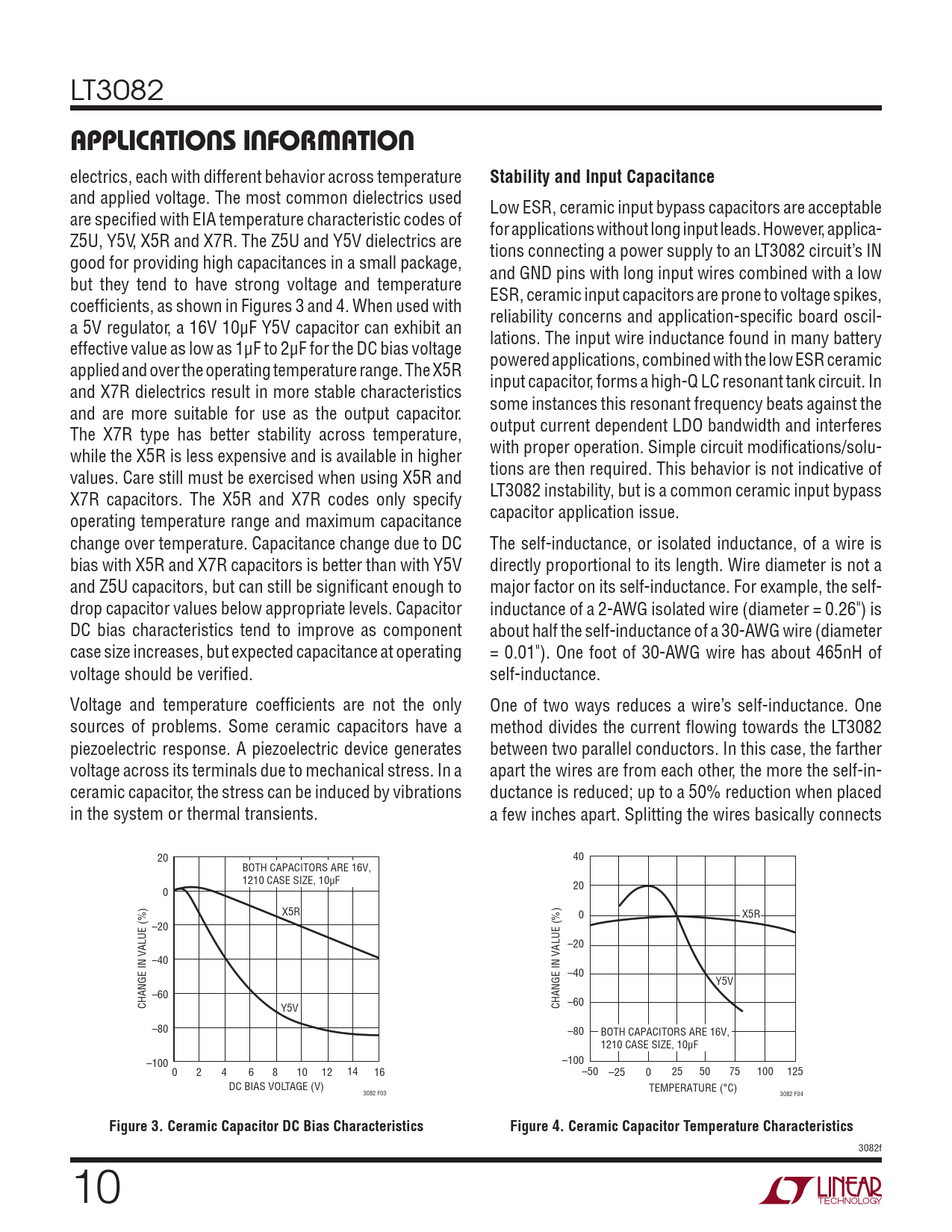 LT3082 APPLICATIONS INFORMATION electrics, each with different behavior across temperature Stability and Input Capacitance and applied voltage. The most common dielectrics used Low ESR, ceramic input bypass capacitors are acceptable are specifi ed with EIA temperature characteristic codes of for applications without long input leads. However, applica- Z5U, Y5V, X5R and X7R. The Z5U and Y5V dielectrics are tions connecting a power supply to an LT3082 circuit’s IN good for providing high capacitances in a small package, and GND pins with long input wires combined with a low but they tend to have strong voltage and temperature ESR, ceramic input capacitors are prone to voltage spikes, coeffi cients, as shown in Figures 3 and 4. When used with reliability concerns and application-specifi c board oscil- a 5V regulator, a 16V 10μF Y5V capacitor can exhibit an lations. The input wire inductance found in many battery effective value as low as 1μF to 2μF for the DC bias voltage powered applications, combined with the low ESR ceramic applied and over the operating temperature range. The X5R input capacitor, forms a high-Q LC resonant tank circuit. In and X7R dielectrics result in more stable characteristics some instances this resonant frequency beats against the and are more suitable for use as the output capacitor. output current dependent LDO bandwidth and interferes The X7R type has better stability across temperature, with proper operation. Simple circuit modifi cations/solu- while the X5R is less expensive and is available in higher values. Care still must be exercised when using X5R and tions are then required. This behavior is not indicative of LT3082 instability, but is a common ceramic input bypass X7R capacitors. The X5R and X7R codes only specify capacitor application issue. operating temperature range and maximum capacitance change over temperature. Capacitance change due to DC The self-inductance, or isolated inductance, of a wire is bias with X5R and X7R capacitors is better than with Y5V directly proportional to its length. Wire diameter is not a and Z5U capacitors, but can still be signifi cant enough to major factor on its self-inductance. For example, the self- drop capacitor values below appropriate levels. Capacitor inductance of a 2-AWG isolated wire (diameter = 0.26") is DC bias characteristics tend to improve as component about half the self-inductance of a 30-AWG wire (diameter case size increases, but expected capacitance at operating = 0.01"). One foot of 30-AWG wire has about 465nH of voltage should be verifi ed. self-inductance. Voltage and temperature coeffi cients are not the only One of two ways reduces a wire’s self-inductance. One sources of problems. Some ceramic capacitors have a method divides the current fl owing towards the LT3082 piezoelectric response. A piezoelectric device generates between two parallel conductors. In this case, the farther voltage across its terminals due to mechanical stress. In a apart the wires are from each other, the more the self-in- ceramic capacitor, the stress can be induced by vibrations ductance is reduced; up to a 50% reduction when placed in the system or thermal transients. a few inches apart. Splitting the wires basically connects 20 40 BOTH CAPACITORS ARE 16V, 1210 CASE SIZE, 10μF 20 0 X5R 0 X5R –20 ALUE (%) –20 –40 –40 Y5V –60 CHANGE IN V –60 Y5V CHANGE IN VALUE (%) –80 –80 BOTH CAPACITORS ARE 16V, 1210 CASE SIZE, 10μF –100 –100 0 2 4 6 8 10 12 14 16 –50 –25 0 25 50 75 100 125 DC BIAS VOLTAGE (V) TEMPERATURE (°C) 3082 F03 3082 F04 Figure 3. Ceramic Capacitor DC Bias CharacteristicsFigure 4. Ceramic Capacitor Temperature Characteristics 3082f 10