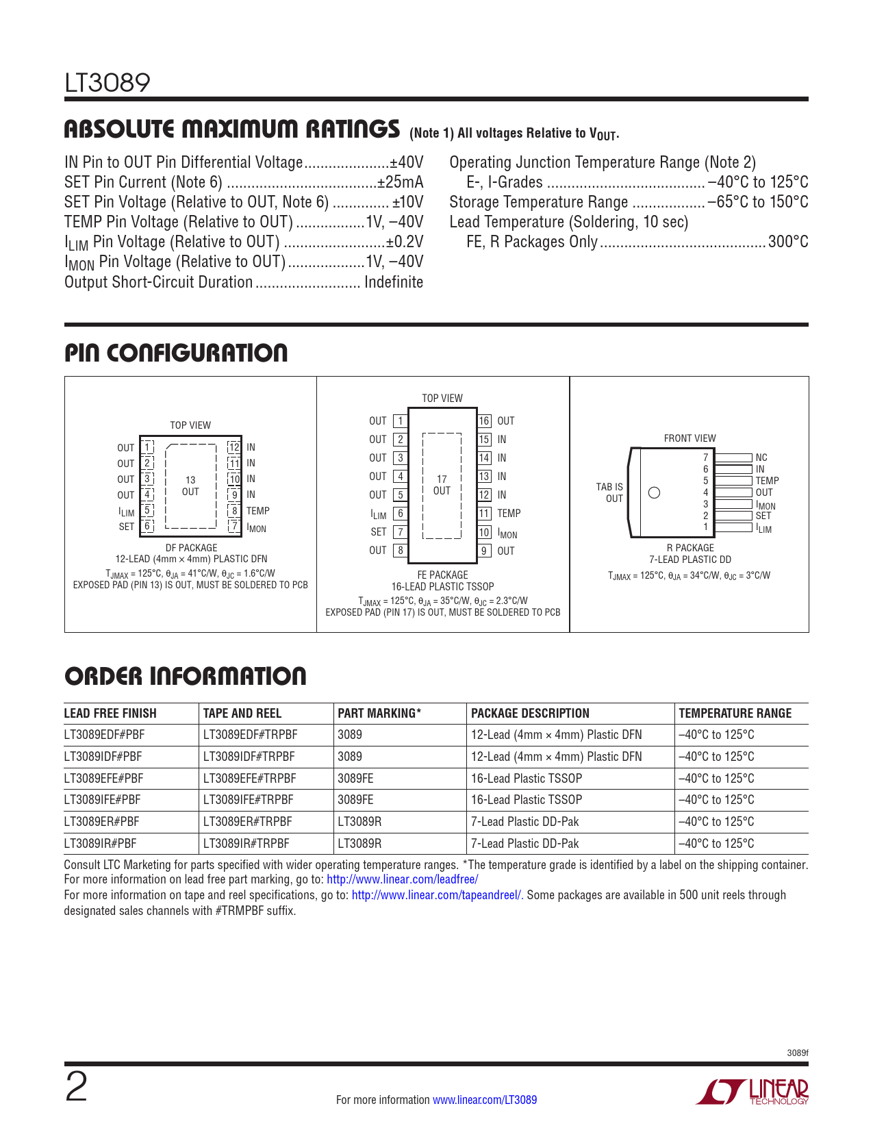 LT3089EDF#PBF LT3089EDF#TRPBF 3089 12-Lead (4mm × 4mm) Plastic DFN –40°C to 125°C LT3089IDF#PBF LT3089IDF#TRPBF 3089 12-Lead (4mm × 4mm) Plastic DFN –40°C to 125°C LT3089EFE#PBF LT3089EFE#TRPBF 3089FE 16-Lead Plastic TSSOP –40°C to 125°C LT3089IFE#PBF LT3089IFE#TRPBF 3089FE 16-Lead Plastic TSSOP –40°C to 125°C LT3089ER#PBF LT3089ER#TRPBF LT3089R 7-Lead Plastic DD-Pak –40°C to 125°C LT3089IR#PBF LT3089IR#TRPBF LT3089R 7-Lead Plastic DD-Pak –40°C to 125°C Consult LTC Marketing for parts specified with wider operating temperature ranges. *The temperature grade is identified by a label on the shipping container. For more information on lead free part marking, go to: http://www.linear.com/leadfree/ For more information on tape and reel specifications, go to: http://www.linear.com/tapeandreel/. Some packages are available in 500 unit reels through designated sales channels with #TRMPBF suffix. 3089f 2 For more information www.linear.com/LT3089 Document Outline Features Applications Typical Application Description Absolute Maximum Ratings Pin Configuration Order Information Electrical Characteristics Typical Performance Characteristics Pin Functions Block Diagram Applications Information Typical Applications Package Description Revision History Typical Application Related Parts