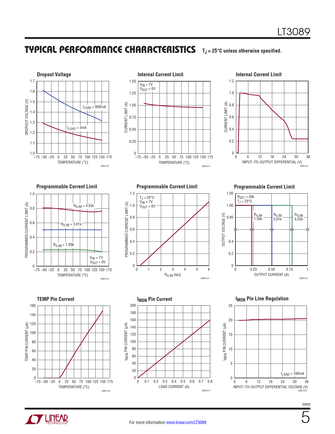 1.0 1.2 1.05 TJ = 25°C RSET = 20k VIN = 7V TJ = 25°C RILIM = 4.53k 1.0 1.00 0.8 VOUT = 0V R R R 0.8 ILIM ILIM ILIM 0.95 1.50k 3.01k 4.53k 0.6 RILIM = 3.01k TAGE (V) 0.6 0.4 0.4 0.4 RILIM = 1.50k OUTPUT VOL 0.2 0.2 0.2 PROGRAMMED CURRENT LIMIT (A) V PROGRAMMED CURRENT LIMIT (A) IN = 7V VOUT = 0V 0 0 0 –75 –50 –25 0 25 50 75 100 125 150 175 0 1 2 3 4 5 6 0 0.25 0.50 0.75 1 TEMPERATURE (°C) RILIM (kΩ) OUTPUT CURRENT (A) 3089 G13 3089 G14 3089 G15
