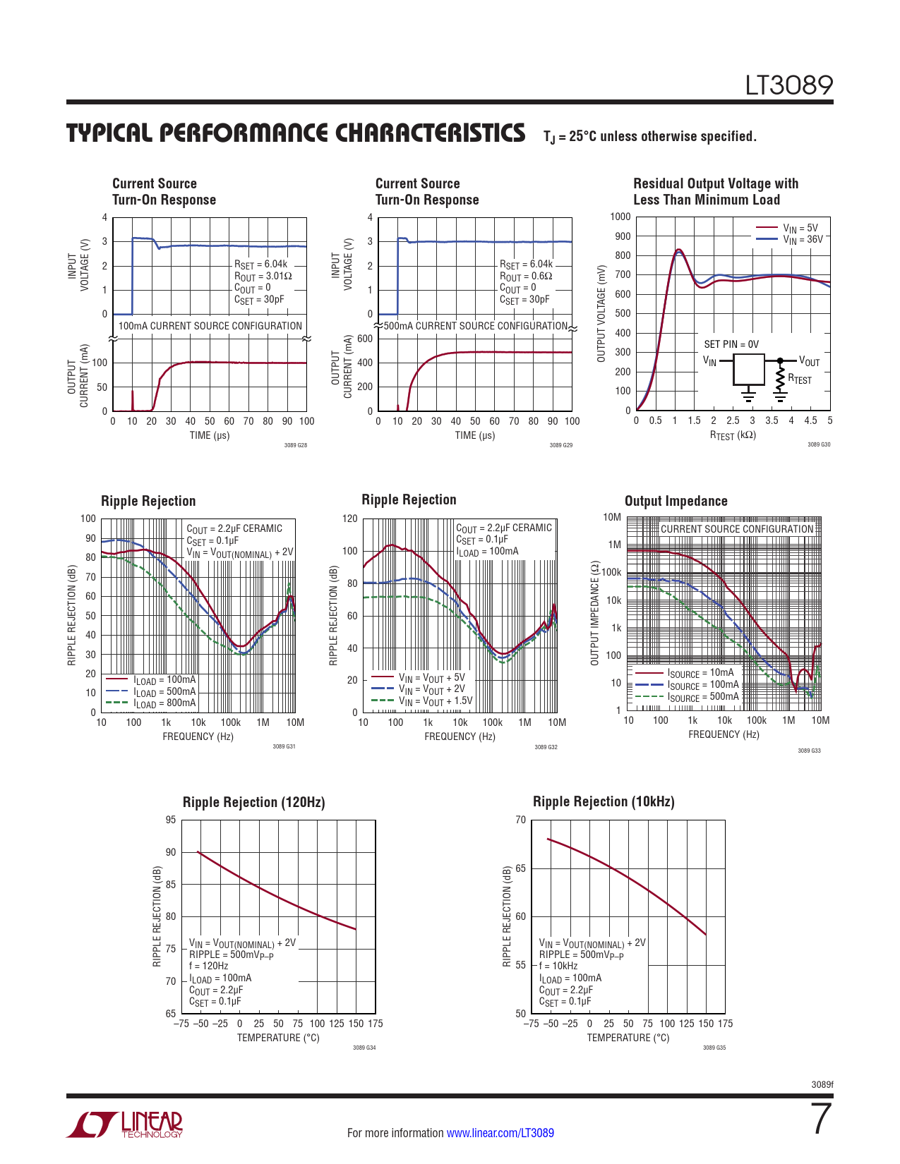 100 120 10M COUT = 2.2µF CERAMIC COUT = 2.2µF CERAMIC CURRENT SOURCE CONFIGURATION 90 CSET = 0.1µF CSET = 0.1µF 1M VIN = VOUT(NOMINAL) + 2V 100 I 80 LOAD = 100mA 70 100k 80 60 10k 50 60 1k 40 30 40 100 RIPPLE REJECTION (dB) RIPPLE REJECTION (dB) OUTPUT IMPEDANCE (Ω) 20 I I SOURCE = 10mA LOAD = 100mA V 20 IN = VOUT + 5V 10 I 10 I SOURCE = 100mA LOAD = 500mA VIN = VOUT + 2V I I SOURCE = 500mA LOAD = 800mA VIN = VOUT + 1.5V 0 0 1 10 100 1k 10k 100k 1M 10M 10 100 1k 10k 100k 1M 10M 10 100 1k 10k 100k 1M 10M FREQUENCY (Hz) FREQUENCY (Hz) FREQUENCY (Hz) 3089 G31 3089 G32 3089 G33