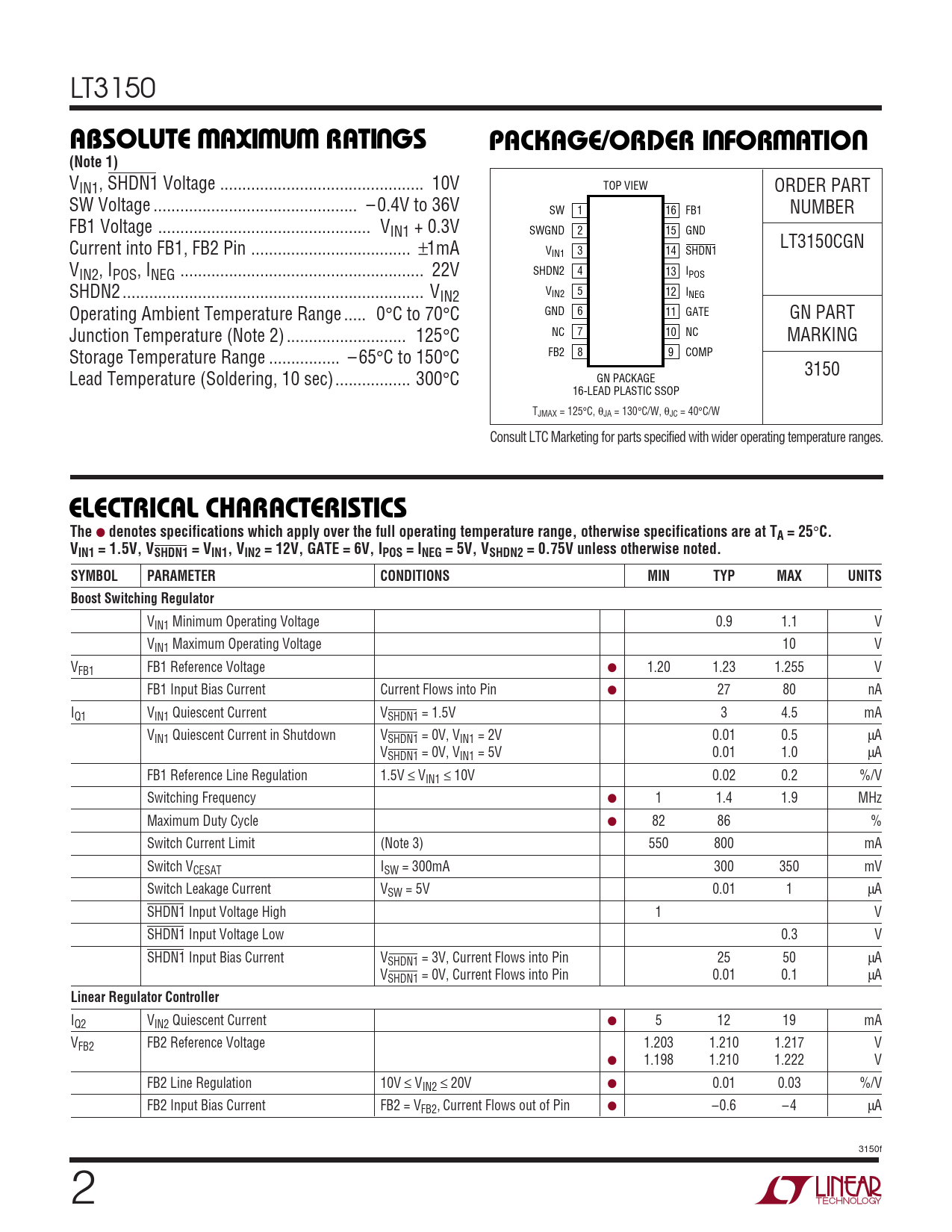 LT3150 WWWUUWUABSOLUTE AXI U RATI GSPACKAGE/ORDER I FOR ATIO(Note 1) VIN1, SHDN1 Voltage .. 10V TOP VIEW ORDER PART SW Voltage .. – 0.4V to 36V SW 1 16 FB1 NUMBER FB1 Voltage .. VIN1 + 0.3V SWGND 2 15 GND Current into FB1, FB2 Pin .. ±1mA LT3150CGN V 3 14 IN1 SHDN1 VIN2, IPOS, INEG ... 22V SHDN2 4 13 IPOS SHDN2 .. VIN2 V 5 12 IN2 INEG Operating Ambient Temperature Range ... 0°C to 70°C GND 6 11 GATE GN PART Junction Temperature (Note 2) ... 125°C NC 7 10 NC MARKING Storage Temperature Range .. – 65°C to 150°C FB2 8 9 COMP 3150 Lead Temperature (Soldering, 10 sec)... 300°C GN PACKAGE 16-LEAD PLASTIC SSOP TJMAX = 125°C, θJA = 130°C/W, θJC = 40°C/W Consult LTC Marketing for parts specified with wider operating temperature ranges. ELECTRICAL CHARACTERISTICSThe ● denotes specifications which apply over the full operating temperature range, otherwise specifications are at TA = 25 ° C.VIN1 = 1.5V, VSHDN1 = VIN1, VIN2 = 12V, GATE = 6V, IPOS = INEG = 5V, VSHDN2 = 0.75V unless otherwise noted.SYMBOLPARAMETERCONDITIONSMINTYPMAXUNITSBoost Switching Regulator VIN1 Minimum Operating Voltage 0.9 1.1 V VIN1 Maximum Operating Voltage 10 V VFB1 FB1 Reference Voltage ● 1.20 1.23 1.255 V FB1 Input Bias Current Current Flows into Pin ● 27 80 nA IQ1 VIN1 Quiescent Current VSHDN1 = 1.5V 3 4.5 mA VIN1 Quiescent Current in Shutdown VSHDN1 = 0V, VIN1 = 2V 0.01 0.5 µA VSHDN1 = 0V, VIN1 = 5V 0.01 1.0 µA FB1 Reference Line Regulation 1.5V ≤ VIN1 ≤ 10V 0.02 0.2 %/V Switching Frequency ● 1 1.4 1.9 MHz Maximum Duty Cycle ● 82 86 % Switch Current Limit (Note 3) 550 800 mA Switch VCESAT ISW = 300mA 300 350 mV Switch Leakage Current VSW = 5V 0.01 1 µA SHDN1 Input Voltage High 1 V SHDN1 Input Voltage Low 0.3 V SHDN1 Input Bias Current VSHDN1 = 3V, Current Flows into Pin 25 50 µA VSHDN1 = 0V, Current Flows into Pin 0.01 0.1 µA Linear Regulator Controller IQ2 VIN2 Quiescent Current ● 5 12 19 mA VFB2 FB2 Reference Voltage 1.203 1.210 1.217 V ● 1.198 1.210 1.222 V FB2 Line Regulation 10V ≤ VIN2 ≤ 20V ● 0.01 0.03 %/V FB2 Input Bias Current FB2 = VFB2, Current Flows out of Pin ● –0.6 –4 µA 3150f 2