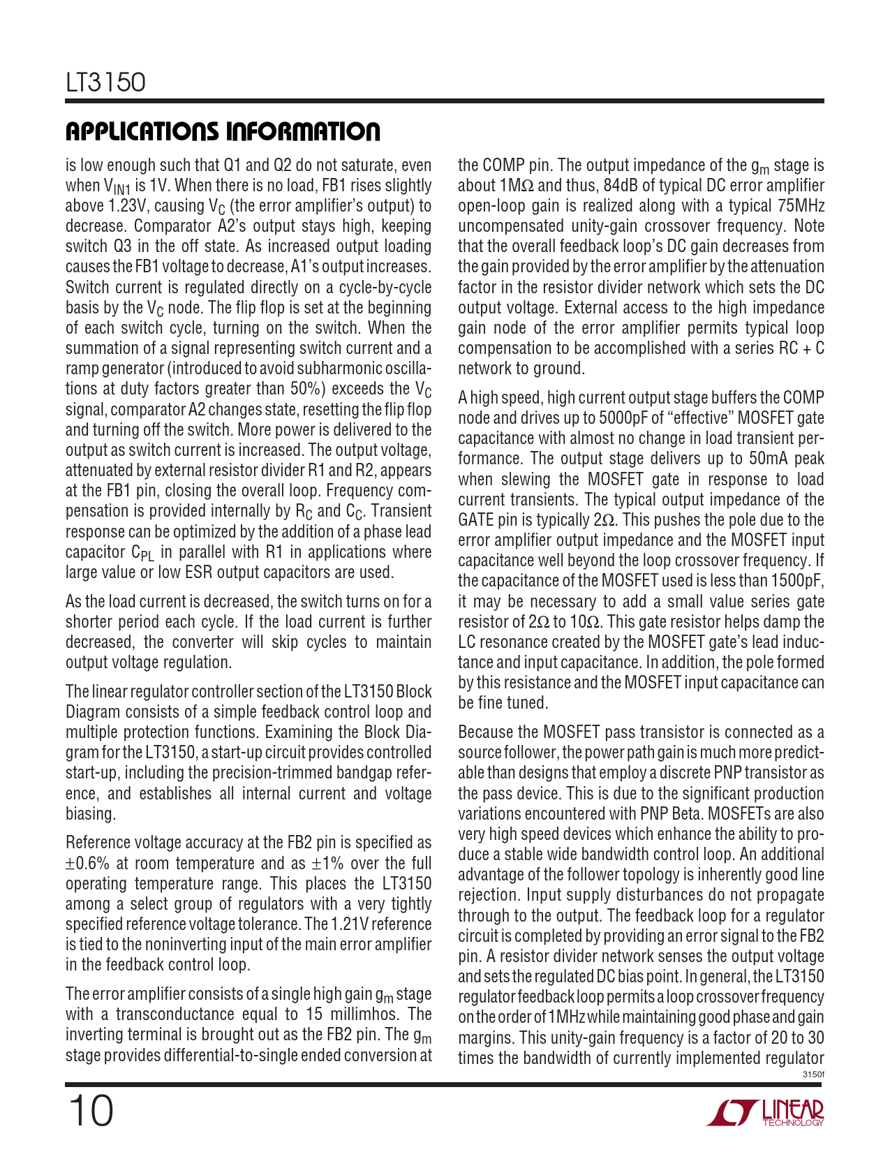 is low enough such that Q1 and Q2 do not saturate, even the COMP pin. The output impedance of the gm stage is when VIN1 is 1V. When there is no load, FB1 rises slightly about 1MΩ and thus, 84dB of typical DC error amplifier above 1.23V, causing VC (the error amplifier’s output) to open-loop gain is realized along with a typical 75MHz decrease. Comparator A2’s output stays high, keeping uncompensated unity-gain crossover frequency. Note switch Q3 in the off state. As increased output loading that the overall feedback loop’s DC gain decreases from causes the FB1 voltage to decrease, A1’s output increases. the gain provided by the error amplifier by the attenuation Switch current is regulated directly on a cycle-by-cycle factor in the resistor divider network which sets the DC basis by the VC node. The flip flop is set at the beginning output voltage. External access to the high impedance of each switch cycle, turning on the switch. When the gain node of the error amplifier permits typical loop summation of a signal representing switch current and a compensation to be accomplished with a series RC + C ramp generator (introduced to avoid subharmonic oscilla- network to ground. tions at duty factors greater than 50%) exceeds the VC A high speed, high current output stage buffers the COMP signal, comparator A2 changes state, resetting the flip flop node and drives up to 5000pF of “effective” MOSFET gate and turning off the switch. More power is delivered to the capacitance with almost no change in load transient per- output as switch current is increased. The output voltage, formance. The output stage delivers up to 50mA peak attenuated by external resistor divider R1 and R2, appears when slewing the MOSFET gate in response to load at the FB1 pin, closing the overall loop. Frequency com- current transients. The typical output impedance of the pensation is provided internally by RC and CC. Transient GATE pin is typically 2Ω. This pushes the pole due to the response can be optimized by the addition of a phase lead error amplifier output impedance and the MOSFET input capacitor CPL in parallel with R1 in applications where capacitance well beyond the loop crossover frequency. If large value or low ESR output capacitors are used. the capacitance of the MOSFET used is less than 1500pF, As the load current is decreased, the switch turns on for a it may be necessary to add a small value series gate shorter period each cycle. If the load current is further resistor of 2Ω to 10Ω. This gate resistor helps damp the decreased, the converter will skip cycles to maintain LC resonance created by the MOSFET gate’s lead induc- output voltage regulation. tance and input capacitance. In addition, the pole formed by this resistance and the MOSFET input capacitance can The linear regulator controller section of the LT3150 Block be fine tuned. Diagram consists of a simple feedback control loop and multiple protection functions. Examining the Block Dia- Because the MOSFET pass transistor is connected as a gram for the LT3150, a start-up circuit provides controlled source follower, the power path gain is much more predict- start-up, including the precision-trimmed bandgap refer- able than designs that employ a discrete PNP transistor as ence, and establishes all internal current and voltage the pass device. This is due to the significant production biasing. variations encountered with PNP Beta. MOSFETs are also very high speed devices which enhance the ability to pro- Reference voltage accuracy at the FB2 pin is specified as ± duce a stable wide bandwidth control loop. An additional 0.6% at room temperature and as ±1% over the full advantage of the follower topology is inherently good line operating temperature range. This places the LT3150 rejection. Input supply disturbances do not propagate among a select group of regulators with a very tightly through to the output. The feedback loop for a regulator specified reference voltage tolerance. The 1.21V reference circuit is completed by providing an error signal to the FB2 is tied to the noninverting input of the main error amplifier pin. A resistor divider network senses the output voltage in the feedback control loop. and sets the regulated DC bias point. In general, the LT3150 The error amplifier consists of a single high gain gm stage regulator feedback loop permits a loop crossover frequency with a transconductance equal to 15 millimhos. The on the order of 1MHz while maintaining good phase and gain inverting terminal is brought out as the FB2 pin. The gm margins. This unity-gain frequency is a factor of 20 to 30 stage provides differential-to-single ended conversion at times the bandwidth of currently implemented regulator 3150f 10