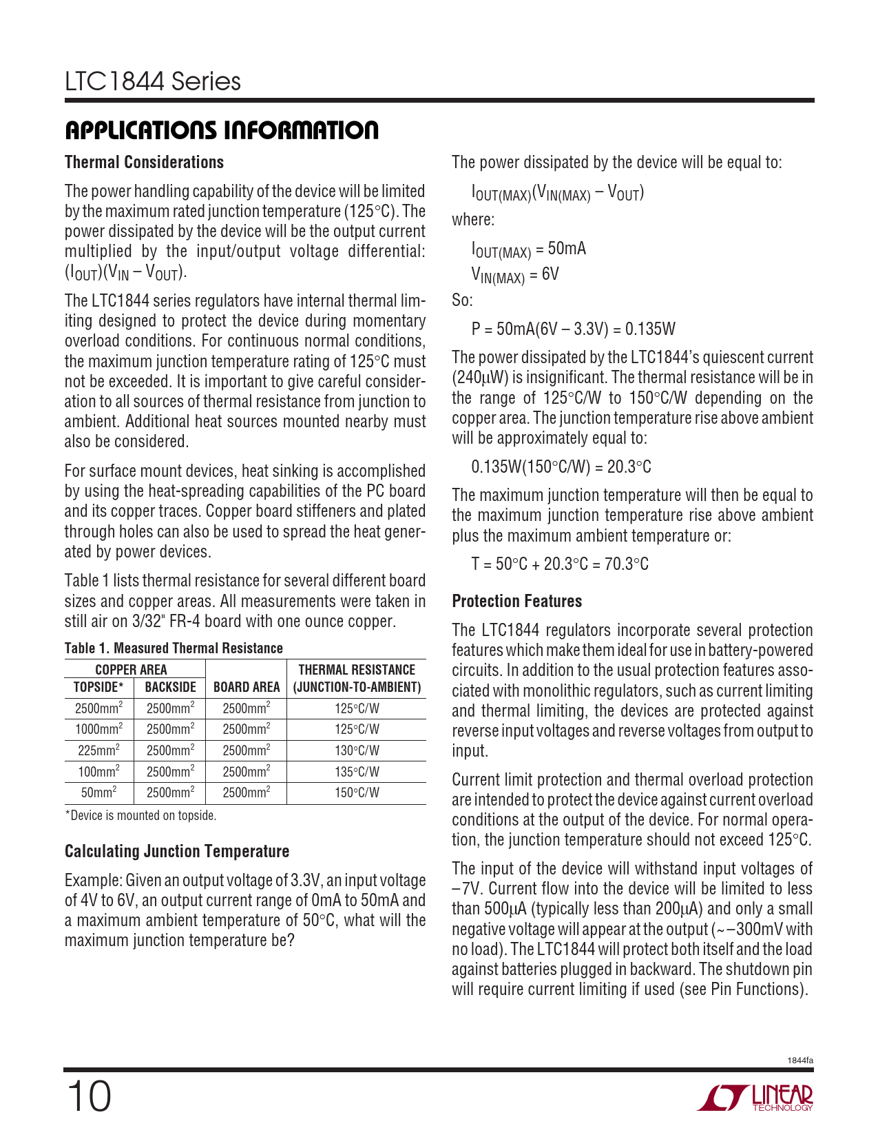 still air on 3/32" FR-4 board with one ounce copper. The LTC1844 regulators incorporate several protection