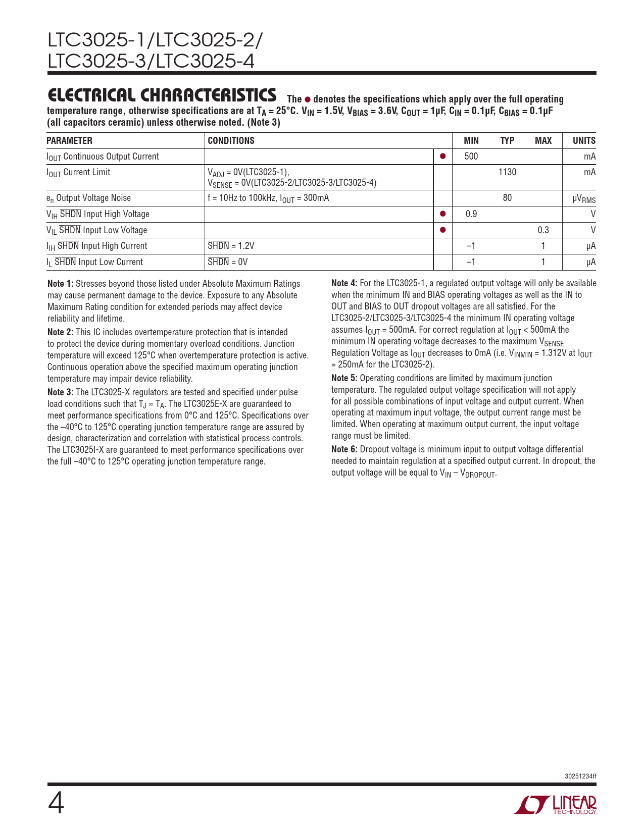 IOUT Continuous Output Current l 500 mA IOUT Current Limit VADJ = 0V(LTC3025-1), 1130 mA VSENSE = 0V(LTC3025-2/LTC3025-3/LTC3025-4) en Output Voltage Noise f = 10Hz to 100kHz, IOUT = 300mA 80 µVRMS VIH SHDN Input High Voltage l 0.9 V VIL SHDN Input Low Voltage l 0.3 V IIH SHDN Input High Current SHDN = 1.2V –1 1 µA IL SHDN Input Low Current SHDN = 0V –1 1 µA