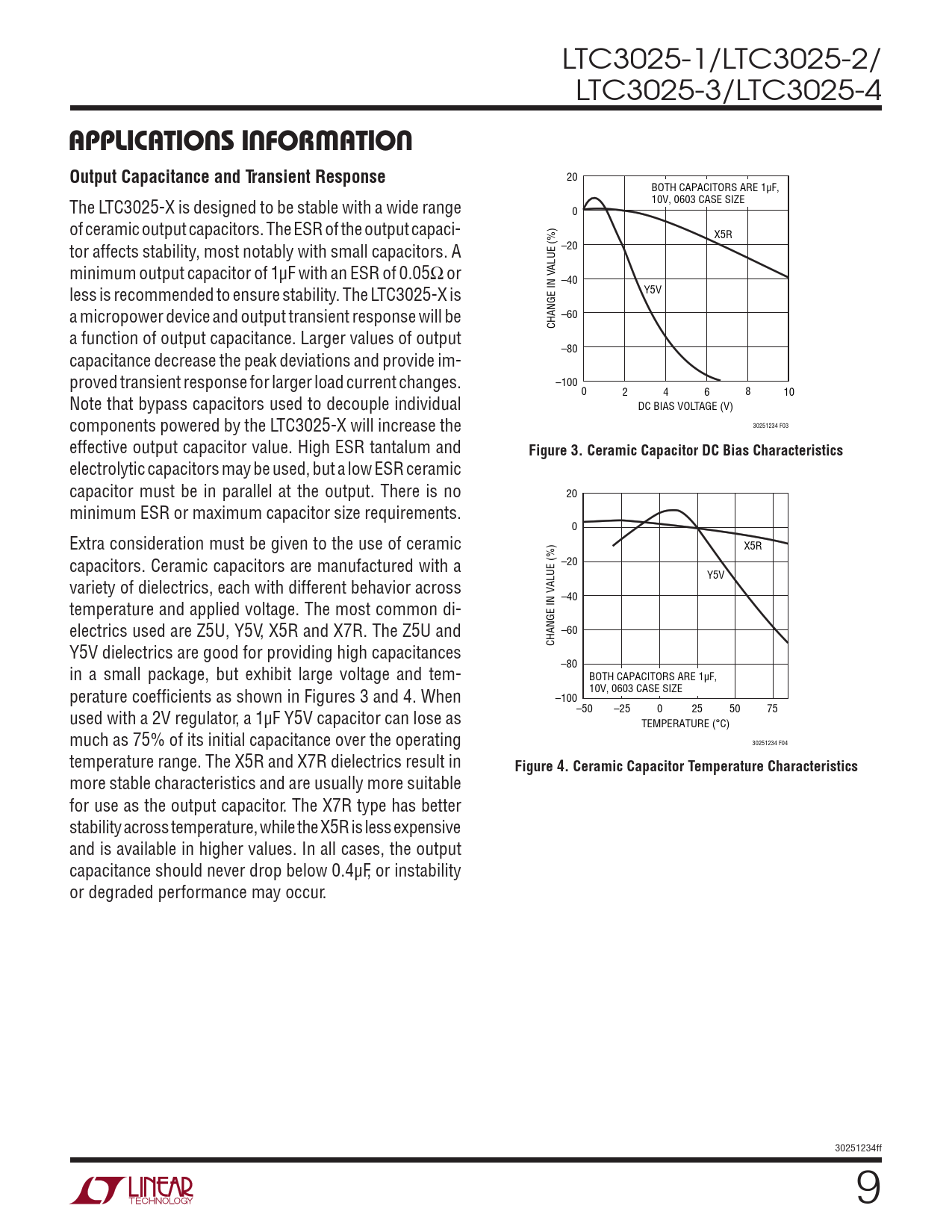 LTC3025-1/LTC3025-2/ LTC3025-3/LTC3025-4 applicaTions inForMaTionOutput Capacitance and Transient Response 20 BOTH CAPACITORS ARE 1µF, The LTC3025-X is designed to be stable with a wide range 10V, 0603 CASE SIZE 0 of ceramic output capacitors. The ESR of the output capaci- X5R tor affects stability, most notably with small capacitors. A –20 minimum output capacitor of 1µF with an ESR of 0.05Ω or ALUE (%) –40 less is recommended to ensure stability. The LTC3025-X is Y5V a micropower device and output transient response will be –60 CHANGE IN V a function of output capacitance. Larger values of output capacitance decrease the peak deviations and provide im- –80 proved transient response for larger load current changes. –100 0 Note that bypass capacitors used to decouple individual 2 4 6 8 10 DC BIAS VOLTAGE (V) components powered by the LTC3025-X will increase the 30251234 F03 effective output capacitor value. High ESR tantalum and Figure 3. Ceramic Capacitor DC Bias Characteristics electrolytic capacitors may be used, but a low ESR ceramic capacitor must be in parallel at the output. There is no 20 minimum ESR or maximum capacitor size requirements. 0 Extra consideration must be given to the use of ceramic X5R capacitors. Ceramic capacitors are manufactured with a –20 Y5V variety of dielectrics, each with different behavior across –40 temperature and applied voltage. The most common di- electrics used are Z5U, Y5V, X5R and X7R. The Z5U and –60 Y5V dielectrics are good for providing high capacitances CHANGE IN VALUE (%) in a small package, but exhibit large voltage and tem- –80 BOTH CAPACITORS ARE 1µF, perature coefficients as shown in Figures 3 and 4. When 10V, 0603 CASE SIZE –100 used with a 2V regulator, a 1µF Y5V capacitor can lose as –50 –25 0 25 50 75 TEMPERATURE (°C) much as 75% of its initial capacitance over the operating 30251234 F04 temperature range. The X5R and X7R dielectrics result in Figure 4. Ceramic Capacitor Temperature Characteristics more stable characteristics and are usually more suitable for use as the output capacitor. The X7R type has better stability across temperature, while the X5R is less expensive and is available in higher values. In all cases, the output capacitance should never drop below 0.4µF, or instability or degraded performance may occur. 30251234ff 9 Document Outline Features Description Applications Typical Application Absolute Maximum Ratings Pin Configuration Order Information Electrical Characteristics Typical Performance Characteristics Pin Functions Block Diagram Applications Information Package Description Revision History Typical Application Related Parts