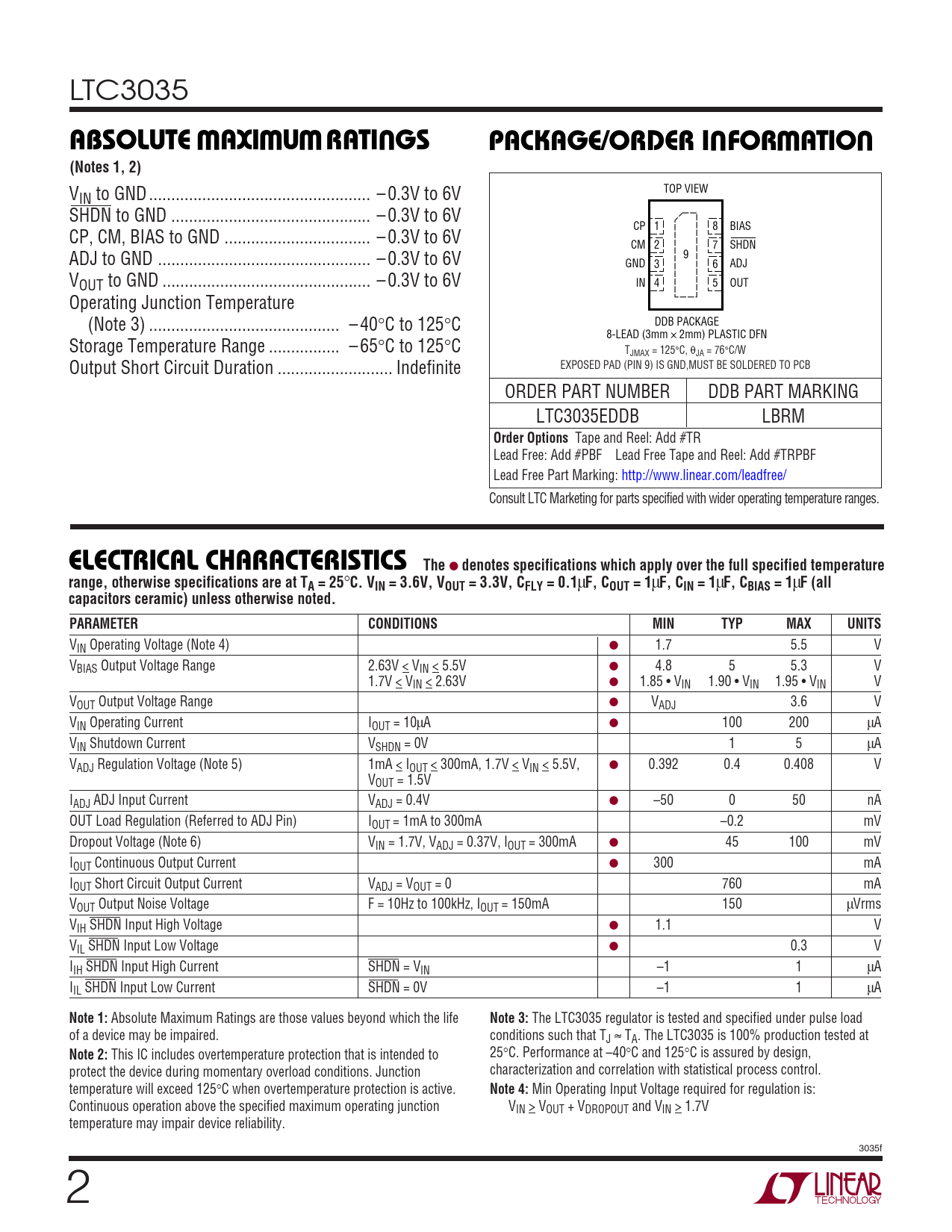 LTC3035 WWWUUWUABSOLUTE AXI URATI GSPACKAGE/ORDER I FOR ATIO(Notes 1, 2) V TOP VIEW IN to GND .. – 0.3V to 6V SHDN to GND ... – 0.3V to 6V CP 1 8 BIAS CP, CM, BIAS to GND ... – 0.3V to 6V CM 2 7 SHDN ADJ to GND .. – 0.3V to 6V 9 GND 3 6 ADJ VOUT to GND ... – 0.3V to 6V IN 4 5 OUT Operating Junction Temperature (Note 3) ... – 40°C to 125°C DDB PACKAGE 8-LEAD (3mm × 2mm) PLASTIC DFN Storage Temperature Range .. – 65°C to 125°C TJMAX = 125°C, θJA = 76°C/W Output Short Circuit Duration .. Indefinite EXPOSED PAD (PIN 9) IS GND,MUST BE SOLDERED TO PCB ORDER PART NUMBER DDB PART MARKING LTC3035EDDB LBRM Order Options Tape and Reel: Add #TR Lead Free: Add #PBF Lead Free Tape and Reel: Add #TRPBF Lead Free Part Marking: http://www.linear.com/leadfree/ Consult LTC Marketing for parts specified with wider operating temperature ranges. ELECTRICAL CHARACTERISTICS The ● denotes specifications which apply over the full specified temperature range, otherwise specifications are at TA = 25 ° C. VIN = 3.6V, VOUT = 3.3V, CFLY = 0.1 µ F, COUT = 1 µ F, CIN = 1 µ F, CBIAS = 1 µ F (allcapacitors ceramic) unless otherwise noted.PARAMETERCONDITIONSMINTYPMAXUNITS VIN Operating Voltage (Note 4) ● 1.7 5.5 V VBIAS Output Voltage Range 2.63V < VIN < 5.5V ● 4.8 5 5.3 V 1.7V < VIN < 2.63V ● 1.85 • VIN 1.90 • VIN 1.95 • VIN V VOUT Output Voltage Range ● VADJ 3.6 V VIN Operating Current IOUT = 10µA ● 100 200 µA VIN Shutdown Current VSHDN = 0V 1 5 µA VADJ Regulation Voltage (Note 5) 1mA < IOUT < 300mA, 1.7V < VIN < 5.5V, ● 0.392 0.4 0.408 V VOUT = 1.5V IADJ ADJ Input Current VADJ = 0.4V ● –50 0 50 nA OUT Load Regulation (Referred to ADJ Pin) IOUT = 1mA to 300mA –0.2 mV Dropout Voltage (Note 6) VIN = 1.7V, VADJ = 0.37V, IOUT = 300mA ● 45 100 mV IOUT Continuous Output Current ● 300 mA IOUT Short Circuit Output Current VADJ = VOUT = 0 760 mA VOUT Output Noise Voltage F = 10Hz to 100kHz, IOUT = 150mA 150 µVrms VIH SHDN Input High Voltage ● 1.1 V VIL SHDN Input Low Voltage ● 0.3 V IIH SHDN Input High Current SHDN = VIN –1 1 µA IIL SHDN Input Low Current SHDN = 0V –1 1 µA Note 1: Absolute Maximum Ratings are those values beyond which the life Note 3: The LTC3035 regulator is tested and specified under pulse load of a device may be impaired. conditions such that TJ ≈ TA. The LTC3035 is 100% production tested at Note 2: This IC includes overtemperature protection that is intended to 25°C. Performance at –40°C and 125°C is assured by design, protect the device during momentary overload conditions. Junction characterization and correlation with statistical process control. temperature will exceed 125°C when overtemperature protection is active. Note 4: Min Operating Input Voltage required for regulation is: Continuous operation above the specified maximum operating junction VIN > VOUT + VDROPOUT and VIN > 1.7V temperature may impair device reliability. 3035f 2