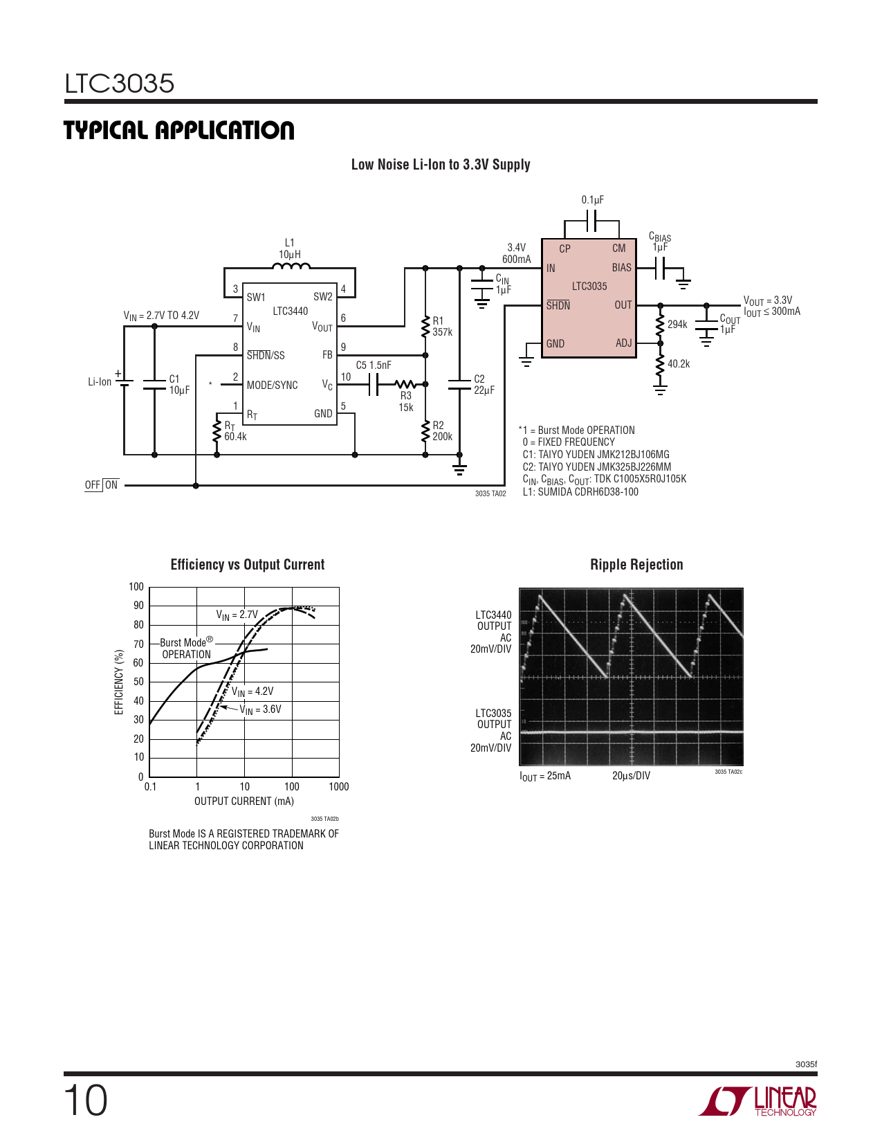 100 90 VIN = 2.7V LTC3440 80 OUTPUT AC 70 Burst Mode® 20mV/DIV OPERATION 60 50 VIN = 4.2V 40 EFFICIENCY (%) VIN = 3.6V LTC3035 30 OUTPUT 20 AC 20mV/DIV 10 3035 TA02c 0 I 20 OUT = 25mA µs/DIV 0.1 1 10 100 1000 OUTPUT CURRENT (mA) 3035 TA02b Burst Mode IS A REGISTERED TRADEMARK OF LINEAR TECHNOLOGY CORPORATION 3035f 10