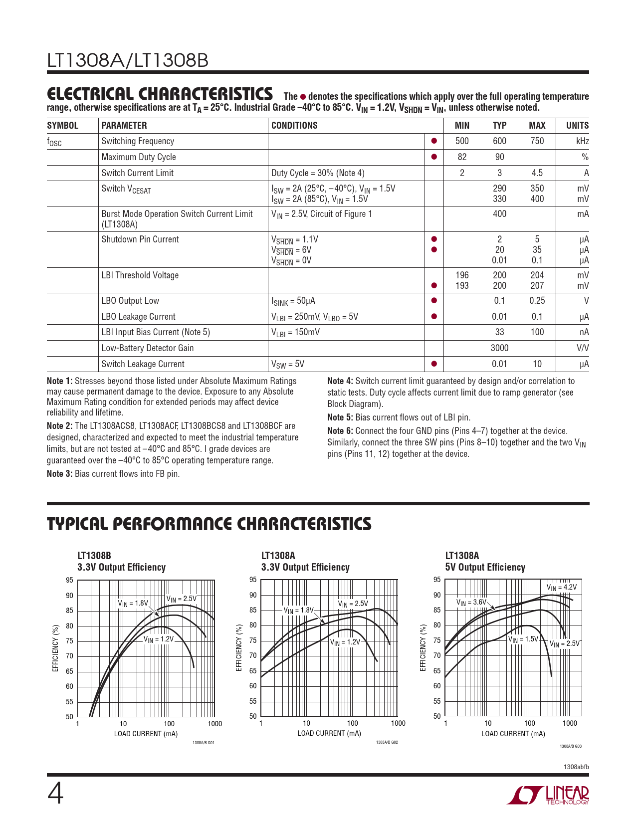 LT1308A/LT1308B ELECTRICAL CHARACTERISTICSThe l denotes the specifi cations which apply over the full operating temperaturerange, otherwise specifi cations are at TA = 25°C. Industrial Grade –40°C to 85°C. VIN = 1.2V, VSHDN = VIN, unless otherwise noted.SYMBOLPARAMETERCONDITIONSMINTYPMAXUNITS fOSC Switching Frequency l 500 600 750 kHz Maximum Duty Cycle l 82 90 % Switch Current Limit Duty Cycle = 30% (Note 4) 2 3 4.5 A Switch VCESAT ISW = 2A (25°C, – 40°C), VIN = 1.5V 290 350 mV ISW = 2A (85°C), VIN = 1.5V 330 400 mV Burst Mode Operation Switch Current Limit VIN = 2.5V, Circuit of Figure 1 400 mA (LT1308A) Shutdown Pin Current VSHDN = 1.1V l 2 5 μA VSHDN = 6V l 20 35 μA VSHDN = 0V 0.01 0.1 μA LBI Threshold Voltage 196 200 204 mV l 193 200 207 mV LBO Output Low ISINK = 50μA l 0.1 0.25 V LBO Leakage Current VLBI = 250mV, VLBO = 5V l 0.01 0.1 μA LBI Input Bias Current (Note 5) VLBI = 150mV 33 100 nA Low-Battery Detector Gain 3000 V/V Switch Leakage Current VSW = 5V l 0.01 10 μA Note 1: Stresses beyond those listed under Absolute Maximum Ratings Note 4: Switch current limit guaranteed by design and/or correlation to may cause permanent damage to the device. Exposure to any Absolute static tests. Duty cycle affects current limit due to ramp generator (see Maximum Rating condition for extended periods may affect device Block Diagram). reliability and lifetime. Note 5: Bias current fl ows out of LBI pin. Note 2: The LT1308ACS8, LT1308ACF, LT1308BCS8 and LT1308BCF are Note 6: Connect the four GND pins (Pins 4–7) together at the device. designed, characterized and expected to meet the industrial temperature Similarly, connect the three SW pins (Pins 8–10) together and the two V limits, but are not tested at –40°C and 85°C. I grade devices are IN pins (Pins 11, 12) together at the device. guaranteed over the –40°C to 85°C operating temperature range. Note 3: Bias current fl ows into FB pin. TYPICAL PERFORMANCE CHARACTERISTICSLT1308BLT1308ALT1308A3.3V Output Effi ciency3.3V Output Effi ciency5V Output Effi ciency 95 95 95 VIN = 4.2V 90 V 90 90 V IN = 2.5V IN = 1.8V V V IN = 2.5V IN = 3.6V 85 85 VIN = 1.8V 85 80 80 80 75 VIN = 1.2V 75 V 75 VIN = 1.5V IN = 1.2V VIN = 2.5V 70 70 70 EFFICIENCY (%) 65 EFFICIENCY (%) 65 EFFICIENCY (%) 65 60 60 60 55 55 55 50 50 50 1 10 100 1000 1 10 100 1000 1 10 100 1000 LOAD CURRENT (mA) LOAD CURRENT (mA) LOAD CURRENT (mA) 1308A/B G01 1308A/B G02 1308A/B G03 1308abfb 4