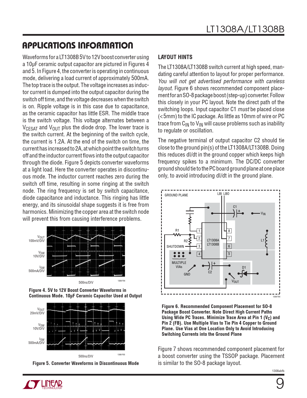 ISW 500mA/DIV Figure 7 shows recommended component placement for 1308 F05 500ns/DIV a boost converter using the TSSOP package. Placement