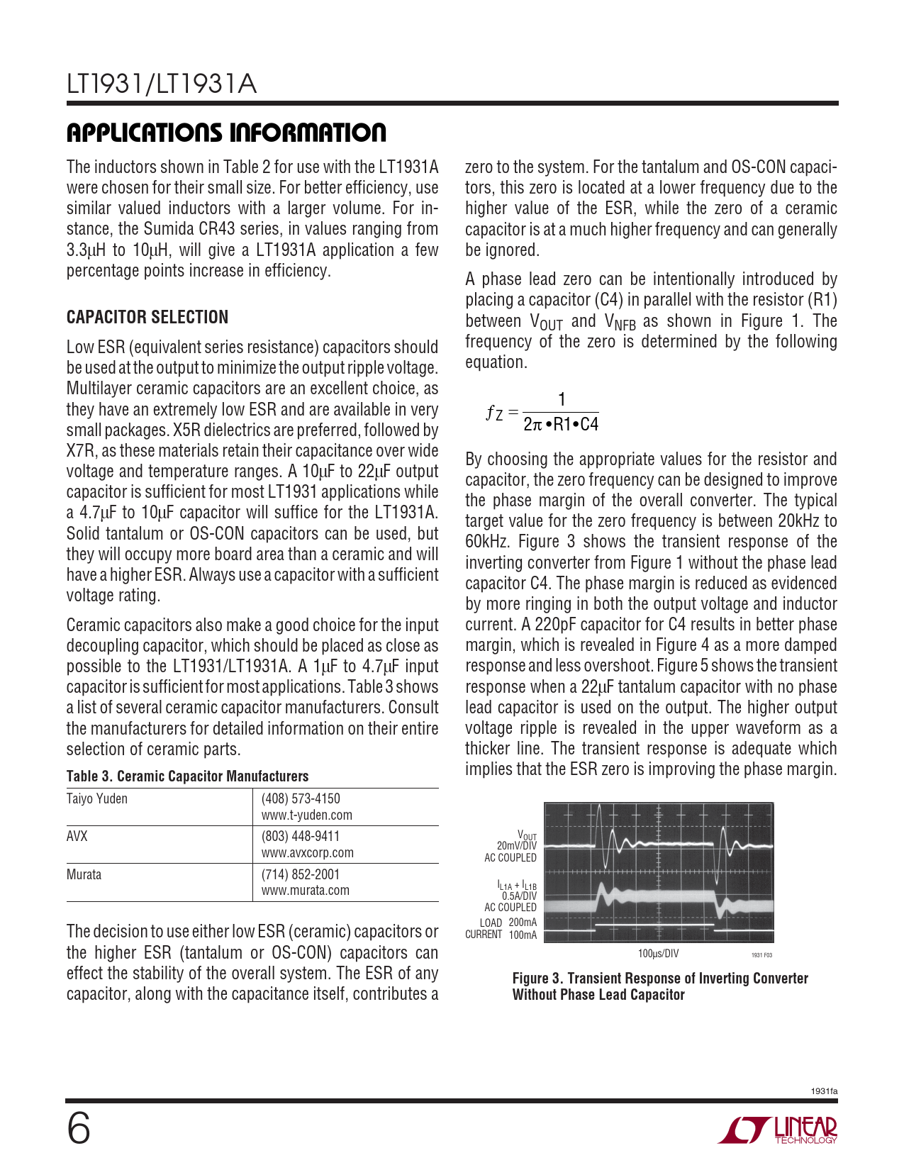 LT1931/LT1931A UUWUAPPLICATIO S I FOR ATIO The inductors shown in Table 2 for use with the LT1931A zero to the system. For the tantalum and OS-CON capaci- were chosen for their small size. For better efficiency, use tors, this zero is located at a lower frequency due to the similar valued inductors with a larger volume. For in- higher value of the ESR, while the zero of a ceramic stance, the Sumida CR43 series, in values ranging from capacitor is at a much higher frequency and can generally 3.3µH to 10µH, will give a LT1931A application a few be ignored. percentage points increase in efficiency. A phase lead zero can be intentionally introduced by placing a capacitor (C4) in parallel with the resistor (R1) CAPACITOR SELECTION between VOUT and VNFB as shown in Figure 1. The Low ESR (equivalent series resistance) capacitors should frequency of the zero is determined by the following be used at the output to minimize the output ripple voltage. equation. Multilayer ceramic capacitors are an excellent choice, as 1 they have an extremely low ESR and are available in very ƒZ = small packages. X5R dielectrics are preferred, followed by 2π •R1•C4 X7R, as these materials retain their capacitance over wide By choosing the appropriate values for the resistor and voltage and temperature ranges. A 10µF to 22µF output capacitor, the zero frequency can be designed to improve capacitor is sufficient for most LT1931 applications while the phase margin of the overall converter. The typical a 4.7µF to 10µF capacitor will suffice for the LT1931A. target value for the zero frequency is between 20kHz to Solid tantalum or OS-CON capacitors can be used, but 60kHz. Figure 3 shows the transient response of the they will occupy more board area than a ceramic and will inverting converter from Figure 1 without the phase lead have a higher ESR. Always use a capacitor with a sufficient capacitor C4. The phase margin is reduced as evidenced voltage rating. by more ringing in both the output voltage and inductor Ceramic capacitors also make a good choice for the input current. A 220pF capacitor for C4 results in better phase decoupling capacitor, which should be placed as close as margin, which is revealed in Figure 4 as a more damped possible to the LT1931/LT1931A. A 1µF to 4.7µF input response and less overshoot. Figure 5 shows the transient capacitor is sufficient for most applications. Table 3 shows response when a 22µF tantalum capacitor with no phase a list of several ceramic capacitor manufacturers. Consult lead capacitor is used on the output. The higher output the manufacturers for detailed information on their entire voltage ripple is revealed in the upper waveform as a selection of ceramic parts. thicker line. The transient response is adequate which implies that the ESR zero is improving the phase margin. Table 3. Ceramic Capacitor Manufacturers Taiyo Yuden (408) 573-4150 www.t-yuden.com AVX (803) 448-9411 VOUT 20mV/DIV www.avxcorp.com AC COUPLED Murata (714) 852-2001 I www.murata.com L1A + IL1B 0.5A/DIV AC COUPLED LOAD 200mA The decision to use either low ESR (ceramic) capacitors or CURRENT 100mA the higher ESR (tantalum or OS-CON) capacitors can 100µs/DIV 1931 F03 effect the stability of the overall system. The ESR of any Figure 3. Transient Response of Inverting Converter capacitor, along with the capacitance itself, contributes a Without Phase Lead Capacitor 1931fa 6