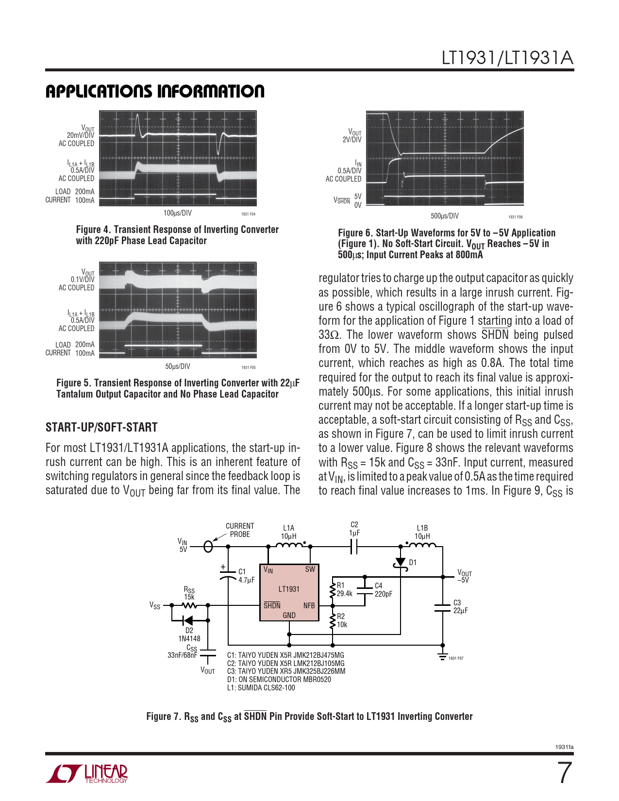 LT1931/LT1931A UUWUAPPLICATIO S I FOR ATIO VOUT V 20mV/DIV OUT 2V/DIV AC COUPLED IL1A + IL1B IIN 0.5A/DIV 0.5A/DIV AC COUPLED AC COUPLED LOAD 200mA 5V CURRENT 100mA VSHDN 0V 100µs/DIV 1931 F04 500µs/DIV 1931 F06 Figure 4. Transient Response of Inverting ConverterFigure 6. Start-Up Waveforms for 5V to – 5V Applicationwith 220pF Phase Lead Capacitor(Figure 1). No Soft-Start Circuit. VOUT Reaches – 5V in500 µ s; Input Current Peaks at 800mA VOUT 0.1V/DIV regulator tries to charge up the output capacitor as quickly AC COUPLED as possible, which results in a large inrush current. Fig- ure 6 shows a typical oscillograph of the start-up wave- IL1A + IL1B 0.5A/DIV form for the application of Figure 1 starting into a load of AC COUPLED 33Ω. The lower waveform shows SHDN being pulsed LOAD 200mA from 0V to 5V. The middle waveform shows the input CURRENT 100mA 50µs/DIV 1931 F05 current, which reaches as high as 0.8A. The total time required for the output to reach its final value is approxi- Figure 5. Transient Response of Inverting Converter with 22 µ F Tantalum Output Capacitor and No Phase Lead Capacitor mately 500µs. For some applications, this initial inrush current may not be acceptable. If a longer start-up time is acceptable, a soft-start circuit consisting of R START-UP/SOFT-START SS and CSS, as shown in Figure 7, can be used to limit inrush current For most LT1931/LT1931A applications, the start-up in- to a lower value. Figure 8 shows the relevant waveforms rush current can be high. This is an inherent feature of with RSS = 15k and CSS = 33nF. Input current, measured switching regulators in general since the feedback loop is at VIN, is limited to a peak value of 0.5A as the time required saturated due to VOUT being far from its final value. The to reach final value increases to 1ms. In Figure 9, CSS is CURRENT C2 L1A L1B PROBE 1µF 10µH 10µH VIN 5V D1 + V C1 IN SW VOUT 4.7µF –5V R1 R C4 SS LT1931 29.4k 15k 220pF V C3 SS SHDN NFB 22µF GND R2 10k D2 1N4148 CSS 33nF/68nF C1: TAIYO YUDEN X5R JMK212BJ475MG 1931 F07 C2: TAIYO YUDEN X5R LMK212BJ105MG VOUT C3: TAIYO YUDEN XR5 JMK325BJ226MM D1: ON SEMICONDUCTOR MBR0520 L1: SUMIDA CLS62-100 Figure 7. RSS and CSS at SHDN Pin Provide Soft-Start to LT1931 Inverting Converter 1931fa 7