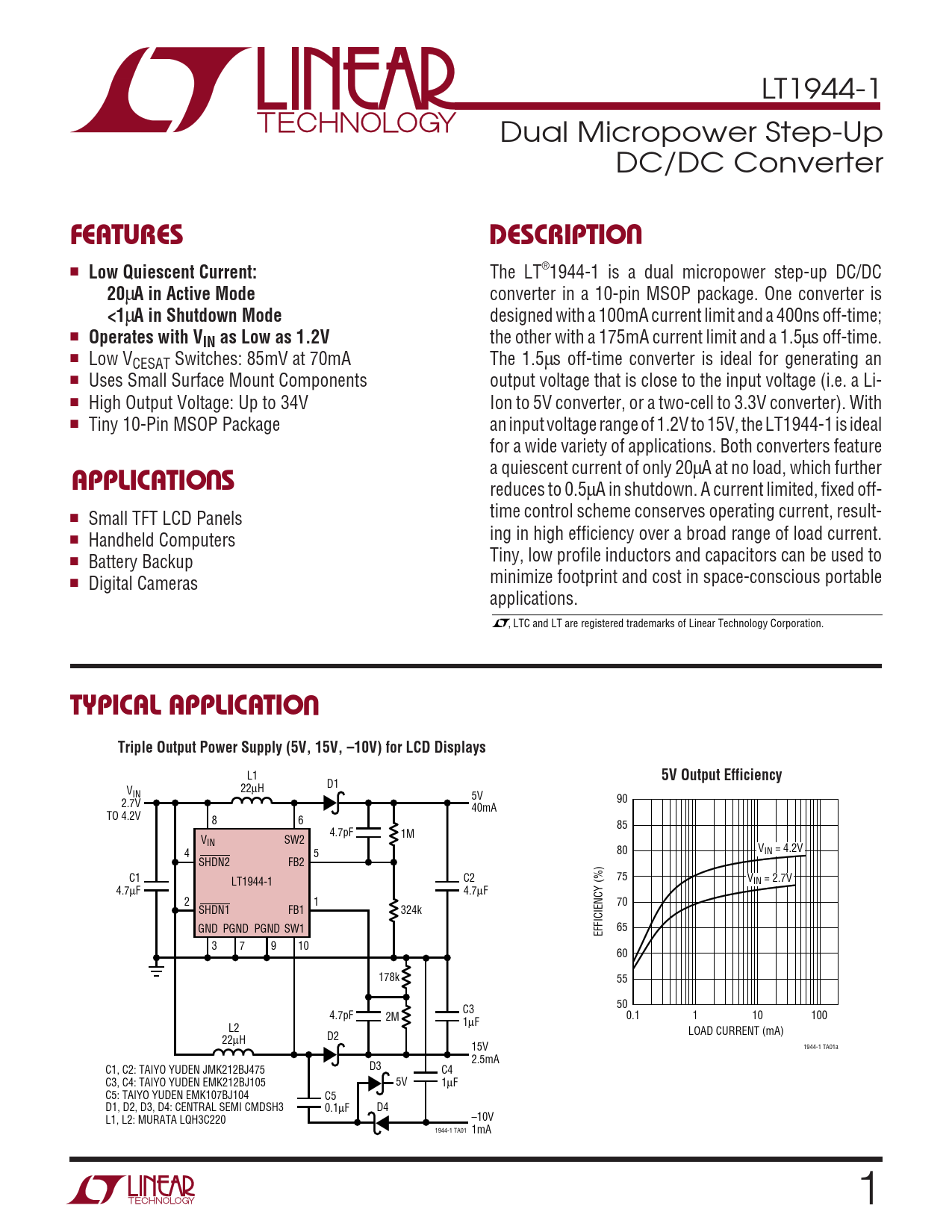 LT1944-1 Dual Micropower Step-Up DC/DC Converter UFEATURESDESCRIPTIO ■ Low Quiescent Current: The LT®1944-1 is a dual micropower step-up DC/DC 20 µ A in Active Mode converter in a 10-pin MSOP package. One converter is <1 µ A in Shutdown Mode designed with a 100mA current limit and a 400ns off-time; ■ Operates with V the other with a 175mA current limit and a 1.5 IN as Low as 1.2V µs off-time. ■ Low V The 1.5 CESAT Switches: 85mV at 70mA µs off-time converter is ideal for generating an ■ Uses Small Surface Mount Components output voltage that is close to the input voltage (i.e. a Li- ■ High Output Voltage: Up to 34V Ion to 5V converter, or a two-cell to 3.3V converter). With ■ Tiny 10-Pin MSOP Package an input voltage range of 1.2V to 15V, the LT1944-1 is ideal for a wide variety of applications. Both converters feature U a quiescent current of only 20µA at no load, which further APPLICATIO S reduces to 0.5µA in shutdown. A current limited, fixed off- ■ time control scheme conserves operating current, result- Small TFT LCD Panels ■ ing in high efficiency over a broad range of load current. Handheld Computers ■ Tiny, low profile inductors and capacitors can be used to Battery Backup ■ minimize footprint and cost in space-conscious portable Digital Cameras applications. , LTC and LT are registered trademarks of Linear Technology Corporation. UTYPICAL APPLICATIOTriple Output Power Supply (5V, 15V, –10V) for LCD Displays L1 5V Output Efficiency 22 V µH D1 IN 5V 2.7V 90 40mA TO 4.2V 8 6 85 4.7pF 1M VIN SW2 V 4 5 80 IN = 4.2V SHDN2 FB2 C1 75 LT1944-1 C2 VIN = 2.7V 4.7µF 4.7µF 2 1 70 SHDN1 FB1 324k GND PGND PGND SW1 65 EFFICIENCY (%) 3 7 9 10 60 178k 55 C3 50 4.7pF 2M 0.1 1 10 100 1µF L2 LOAD CURRENT (mA) 22µH D2 15V 1944-1 TA01a 2.5mA D3 C1, C2: TAIYO YUDEN JMK212BJ475 C4 C3, C4: TAIYO YUDEN EMK212BJ105 5V 1µF C5: TAIYO YUDEN EMK107BJ104 C5 D1, D2, D3, D4: CENTRAL SEMI CMDSH3 0.1µF D4 –10V L1, L2: MURATA LQH3C220 1944-1 TA01 1mA 1