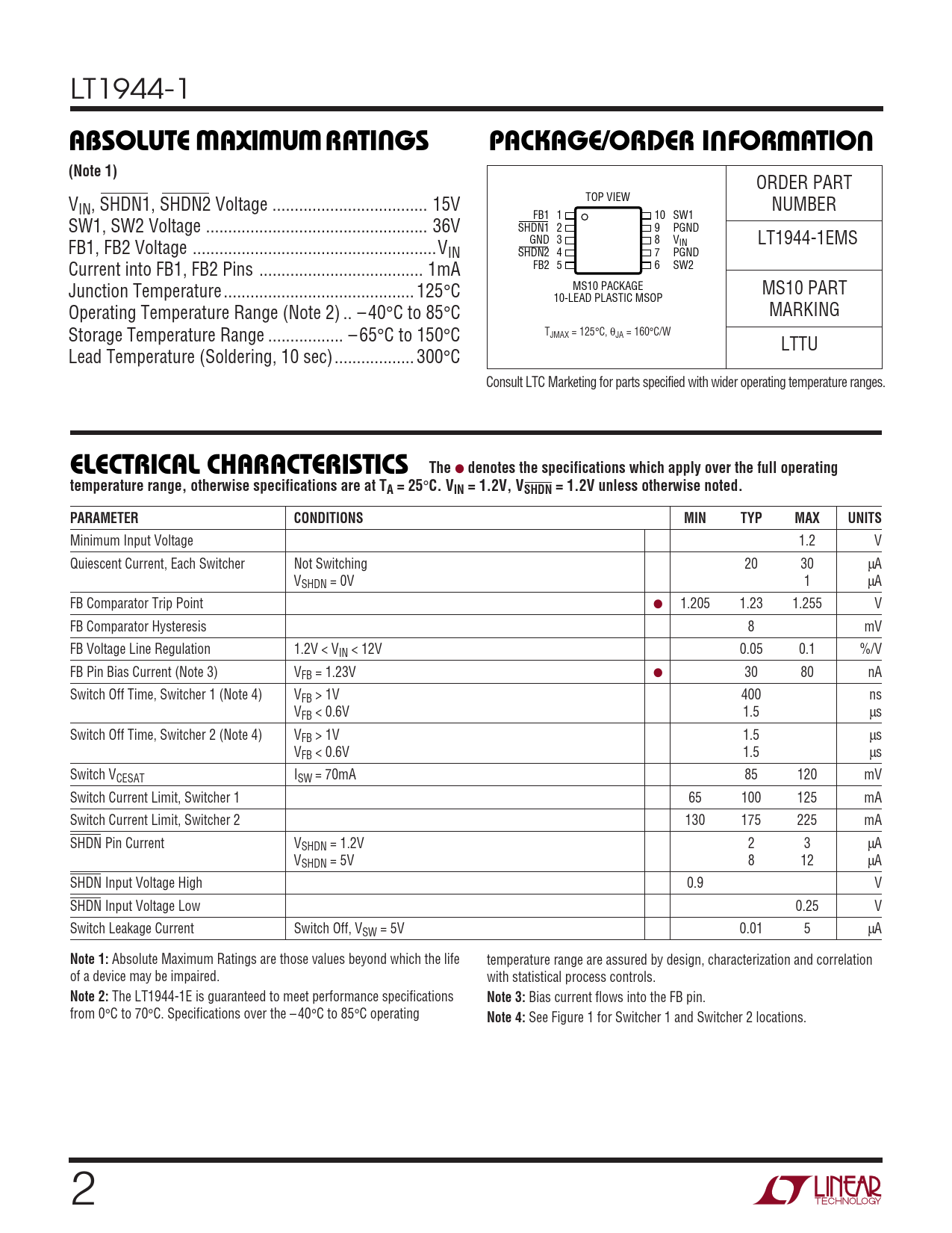 LT1944-1 WWWUUWUABSOLUTE AXI URATI GSPACKAGE/ORDER I FOR ATIO(Note 1) ORDER PART V TOP VIEW IN, SHDN1, SHDN2 Voltage ... 15V NUMBER FB1 1 10 SW1 SW1, SW2 Voltage .. 36V SHDN1 2 9 PGND GND 3 8 VIN LT1944-1EMS FB1, FB2 Voltage ...VIN SHDN2 4 7 PGND Current into FB1, FB2 Pins ... 1mA FB2 5 6 SW2 Junction Temperature ... 125°C MS10 PACKAGE MS10 PART 10-LEAD PLASTIC MSOP Operating Temperature Range (Note 2) .. – 40°C to 85°C MARKING Storage Temperature Range ... – 65°C to 150°C TJMAX = 125°C, θJA = 160°C/W LTTU Lead Temperature (Soldering, 10 sec).. 300°C Consult LTC Marketing for parts specified with wider operating temperature ranges. ELECTRICAL CHARACTERISTICS The ● denotes the specifications which apply over the full operatingtemperature range, otherwise specifications are at TA = 25 ° C. VIN = 1.2V, VSHDN = 1.2V unless otherwise noted.PARAMETERCONDITIONSMINTYPMAXUNITS Minimum Input Voltage 1.2 V Quiescent Current, Each Switcher Not Switching 20 30 µA VSHDN = 0V 1 µA FB Comparator Trip Point ● 1.205 1.23 1.255 V FB Comparator Hysteresis 8 mV FB Voltage Line Regulation 1.2V < VIN < 12V 0.05 0.1 %/V FB Pin Bias Current (Note 3) VFB = 1.23V ● 30 80 nA Switch Off Time, Switcher 1 (Note 4) VFB > 1V 400 ns VFB < 0.6V 1.5 µs Switch Off Time, Switcher 2 (Note 4) VFB > 1V 1.5 µs VFB < 0.6V 1.5 µs Switch VCESAT ISW = 70mA 85 120 mV Switch Current Limit, Switcher 1 65 100 125 mA Switch Current Limit, Switcher 2 130 175 225 mA SHDN Pin Current VSHDN = 1.2V 2 3 µA VSHDN = 5V 8 12 µA SHDN Input Voltage High 0.9 V SHDN Input Voltage Low 0.25 V Switch Leakage Current Switch Off, VSW = 5V 0.01 5 µA Note 1: Absolute Maximum Ratings are those values beyond which the life temperature range are assured by design, characterization and correlation of a device may be impaired. with statistical process controls. Note 2: The LT1944-1E is guaranteed to meet performance specifications Note 3: Bias current flows into the FB pin. from 0°C to 70°C. Specifications over the – 40°C to 85°C operating Note 4: See Figure 1 for Switcher 1 and Switcher 2 locations. 2