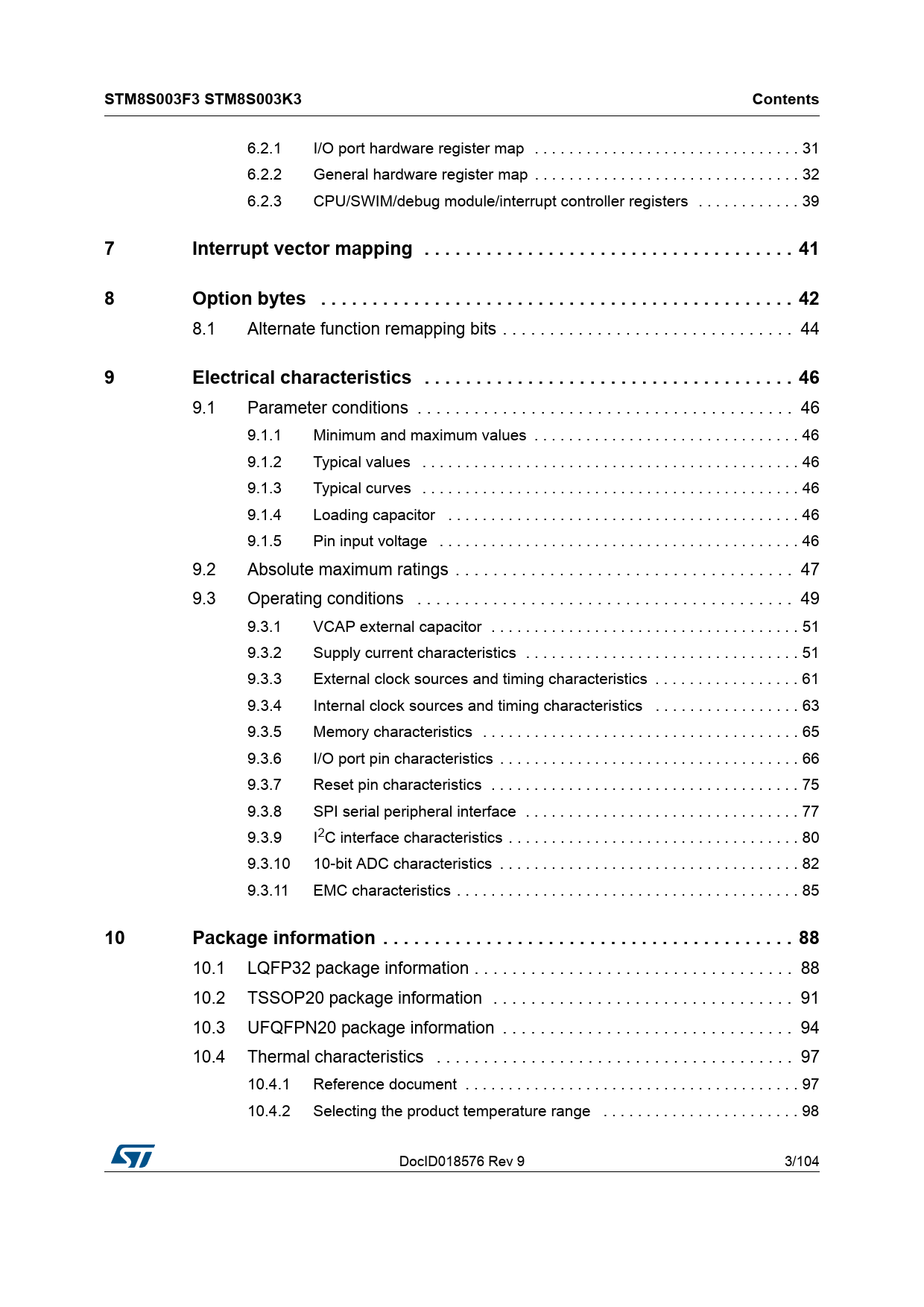 STM8S003F3 STM8S003K3. Contents. Interrupt vector mapping . 41. Option bytes . 42. Electrical characteristics . 46