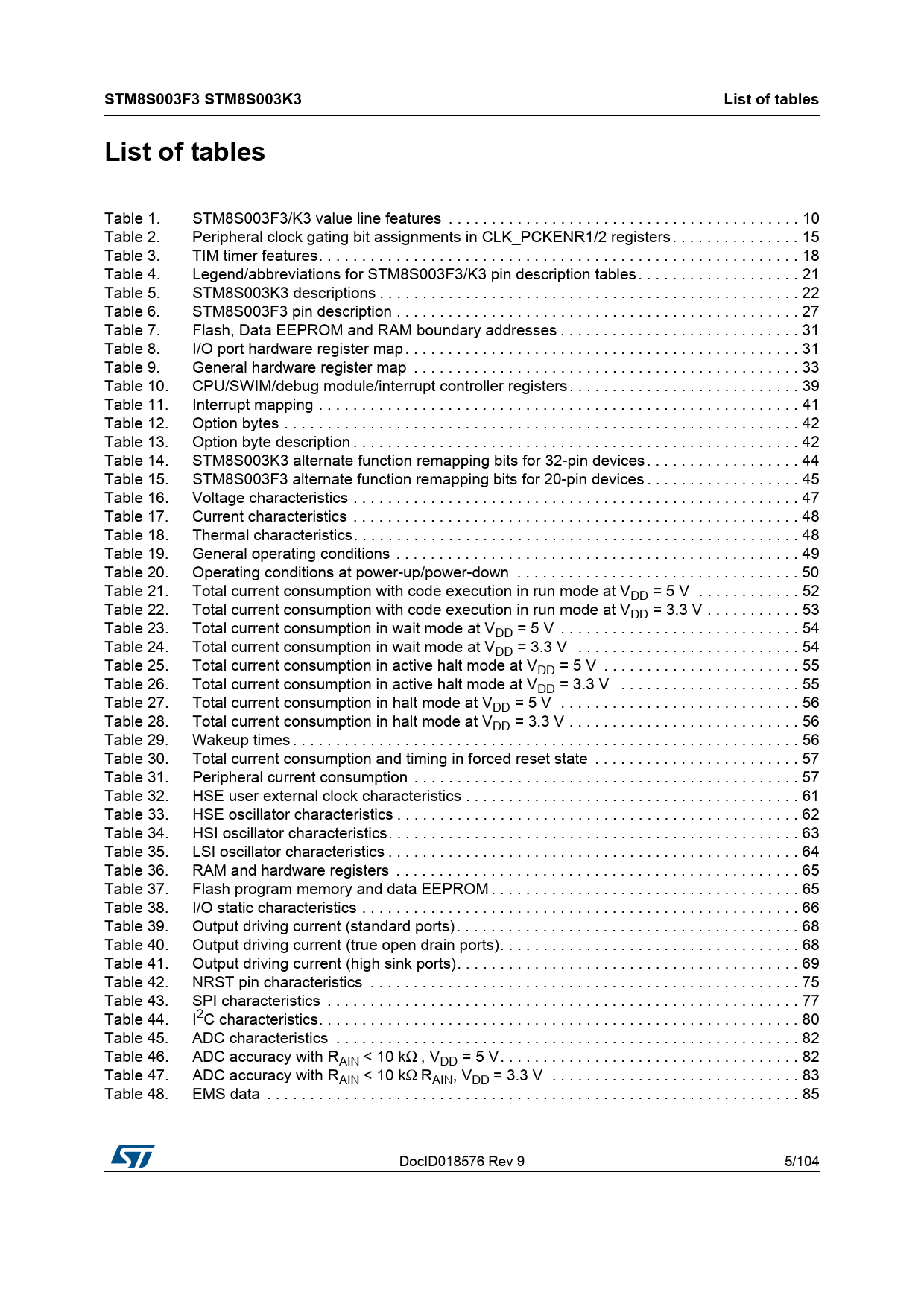 Páginas / Página104 / 5 — STM8S003F3 STM8S003K3. List of tables