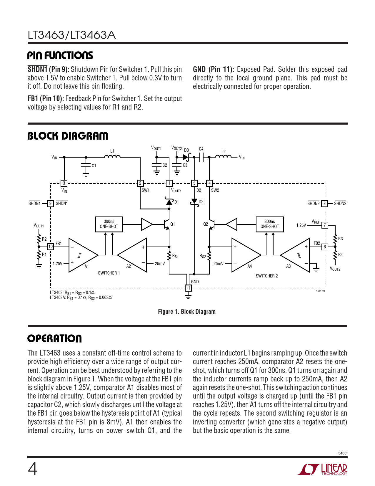 LT3463/LT3463A UUUPI FU CTIO SSHDN1 (Pin 9): Shutdown Pin for Switcher 1. Pull this pin GND (Pin 11): Exposed Pad. Solder this exposed pad above 1.5V to enable Switcher 1. Pull below 0.3V to turn directly to the local ground plane. This pad must be it off. Do not leave this pin floating. electrically connected for proper operation. FB1 (Pin 10): Feedback Pin for Switcher 1. Set the output voltage by selecting values for R1 and R2. WBLOCK DIAGRA VOUT1 VOUT2 L1 D3 C4 L2 VIN VIN C1 C2 C3 3 2 1 5 4 VIN SW1 VOUT1 D2 SW2 D1 D2 SHDN1 9 SHDN1 SHDN2 8 SHDN2 300ns 300ns V Q1 REF V Q2 OUT1 ONE-SHOT 1.25V ONE-SHOT 7 R2 R3 FB1 FB2 10 – + + + 6 R1 R4 RS1 RS2 1.25V + – 25mV 25mV – – A1 A2 A4 A3 VOUT2 SWITCHER 1 SWITCHER 2 GND 11 LT3463: R 3463 F01 S1 = RS2 = 0.1Ω LT3463A: RS1 = 0.1Ω, RS2 = 0.063Ω Figure 1. Block DiagramUOPERATIO The LT3463 uses a constant off-time control scheme to current in inductor L1 begins ramping up. Once the switch provide high efficiency over a wide range of output cur- current reaches 250mA, comparator A2 resets the one- rent. Operation can be best understood by referring to the shot, which turns off Q1 for 300ns. Q1 turns on again and block diagram in Figure 1. When the voltage at the FB1 pin the inductor currents ramp back up to 250mA, then A2 is slightly above 1.25V, comparator A1 disables most of again resets the one-shot. This switching action continues the internal circuitry. Output current is then provided by until the output voltage is charged up (until the FB1 pin capacitor C2, which slowly discharges until the voltage at reaches 1.25V), then A1 turns off the internal circuitry and the FB1 pin goes below the hysteresis point of A1 (typical the cycle repeats. The second switching regulator is an hysteresis at the FB1 pin is 8mV). A1 then enables the inverting converter (which generates a negative output) internal circuitry, turns on power switch Q1, and the but the basic operation is the same. 3463f 4