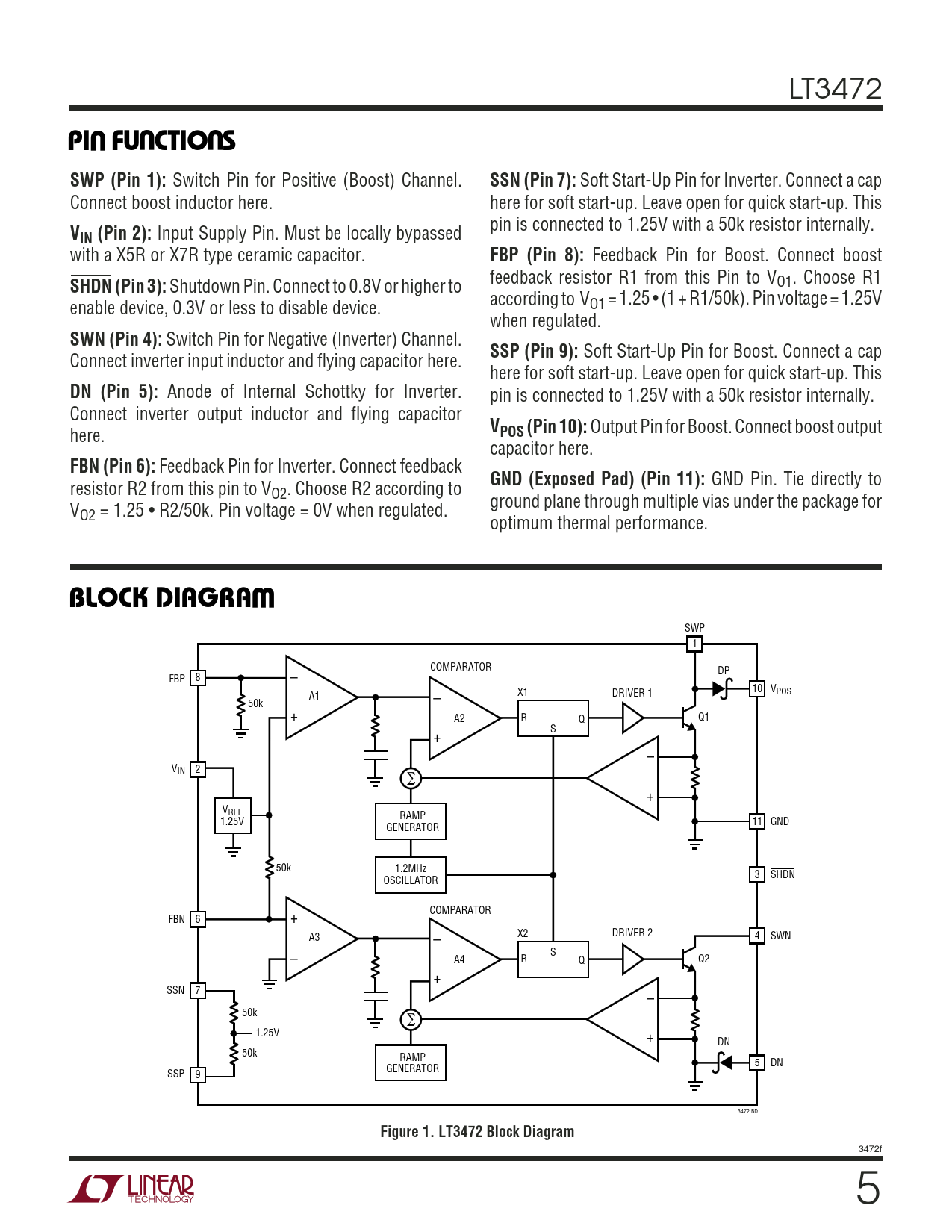 LT3472 UUUPI FU CTIO SSWP (Pin 1): Switch Pin for Positive (Boost) Channel. SSN (Pin 7): Soft Start-Up Pin for Inverter. Connect a cap Connect boost inductor here. here for soft start-up. Leave open for quick start-up. This pin is connected to 1.25V with a 50k resistor internally. VIN (Pin 2): Input Supply Pin. Must be locally bypassed with a X5R or X7R type ceramic capacitor. FBP (Pin 8): Feedback Pin for Boost. Connect boost feedback resistor R1 from this Pin to V SHDN (Pin 3): Shutdown Pin. Connect to 0.8V or higher to O1. Choose R1 according to V enable device, 0.3V or less to disable device. O1 = 1.25 • (1 + R1/50k). Pin voltage = 1.25V when regulated. SWN (Pin 4): Switch Pin for Negative (Inverter) Channel. SSP (Pin 9): Soft Start-Up Pin for Boost. Connect a cap Connect inverter input inductor and flying capacitor here. here for soft start-up. Leave open for quick start-up. This DN (Pin 5): Anode of Internal Schottky for Inverter. pin is connected to 1.25V with a 50k resistor internally. Connect inverter output inductor and flying capacitor V here. POS (Pin 10): Output Pin for Boost. Connect boost output capacitor here. FBN (Pin 6): Feedback Pin for Inverter. Connect feedback GND (Exposed Pad) (Pin 11): GND Pin. Tie directly to resistor R2 from this pin to VO2. Choose R2 according to ground plane through multiple vias under the package for VO2 = 1.25 • R2/50k. Pin voltage = 0V when regulated. optimum thermal performance. WBLOCK DIAGRA SWP 1 COMPARATOR DP FBP 8 – 10 V A1 – X1 DRIVER 1 POS 50k + A2 R Q Q1 S + – VIN 2 ∑ + VREF RAMP 1.25V 11 GND GENERATOR 50k 1.2MHz 3 SHDN OSCILLATOR COMPARATOR FBN 6 + DRIVER 2 A3 – X2 4 SWN S – A4 R Q Q2 + SSN 7 – 50k ∑ 1.25V + DN 50k RAMP 5 DN GENERATOR SSP 9 3472 BD Figure 1. LT3472 Block Diagram 3472f 5