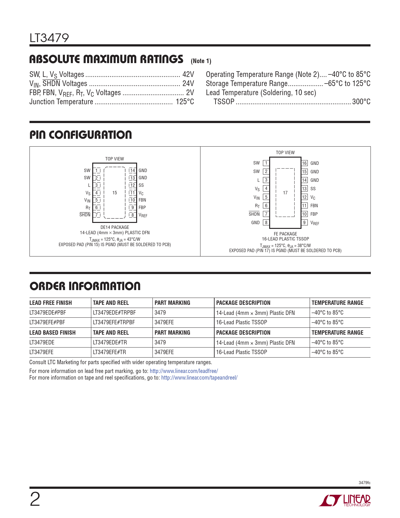 LT3479EDE#PBF LT3479EDE#TRPBF 3479 14-Lead (4mm × 3mm) Plastic DFN –40°C to 85°C LT3479EFE#PBF LT3479EFE#TRPBF 3479EFE 16-Lead Plastic TSSOP –40°C to 85°C