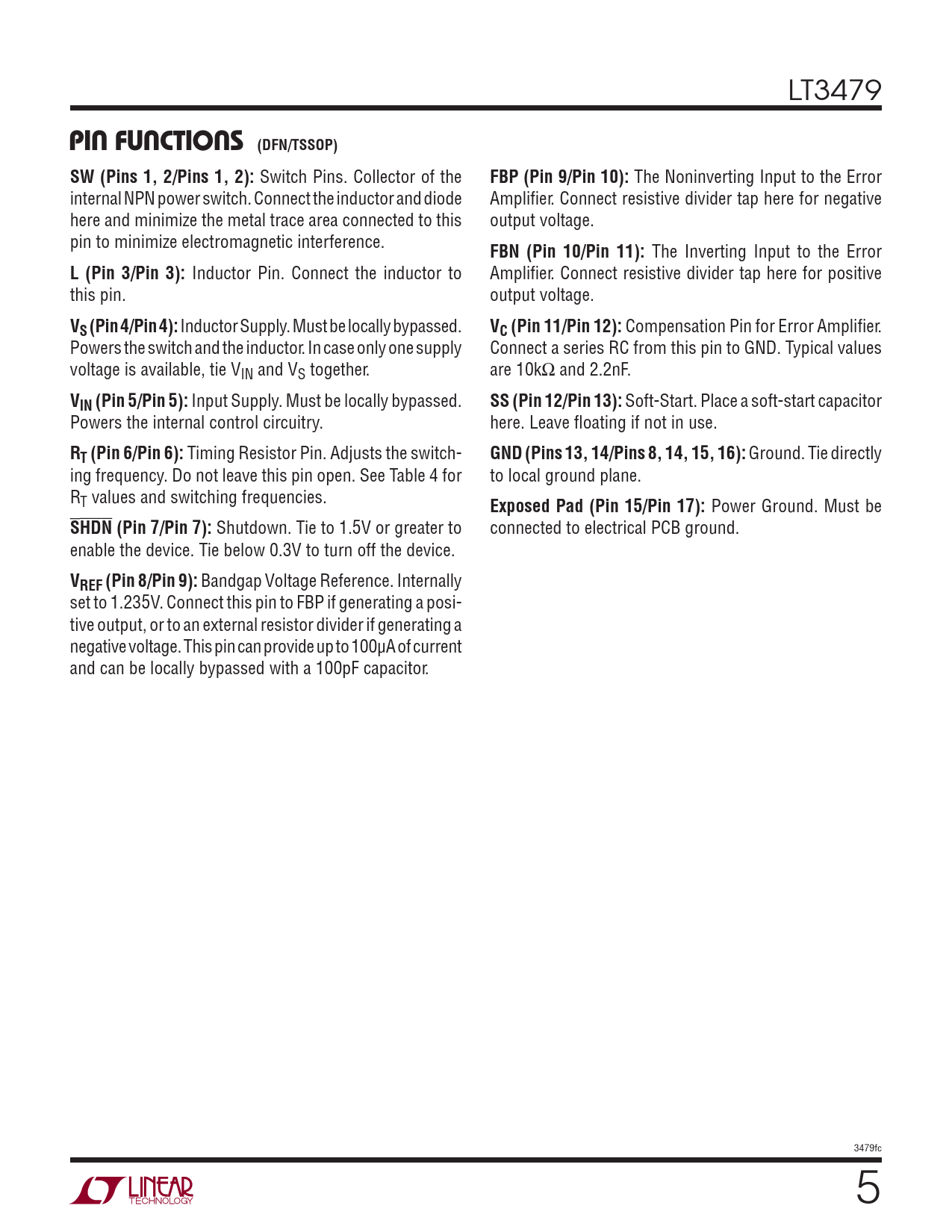 PIN FUNCTIONS (DFN/TSSOP). SW (Pins 1, 2/Pins 1, 2):. FBP (Pin 9/Pin 10):. FBN (Pin 10/Pin 11):. L (Pin 3/Pin 3):