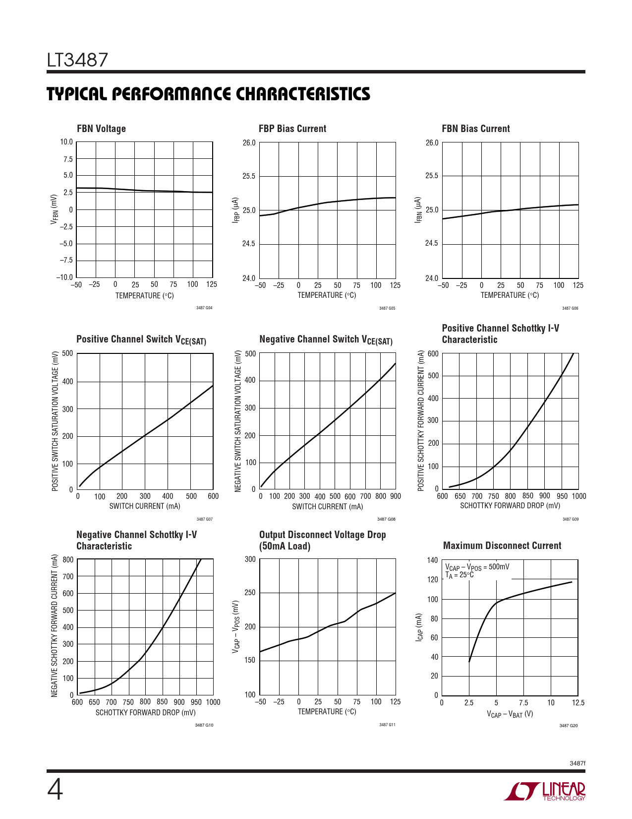 500 500 600 500 400 400 400 300 300 300 200 200 200 100 100 100 POSITIVE SWITCH SATURATION VOLTAGE (mV) 0 NEGATIVE SWITCH SATURATION VOLTAGE (mV) 0 POSITIVE SCHOTTKY FORWARD CURRENT (mA) 0 0 100 200 300 400 500 600 0 100 200 300 400 500 600 700 800 900 600 650 700 750 800 850 900 950 1000 SWITCH CURRENT (mA) SWITCH CURRENT (mA) SCHOTTKY FORWARD DROP (mV) 3487 G07 3487 G08 3487 G09