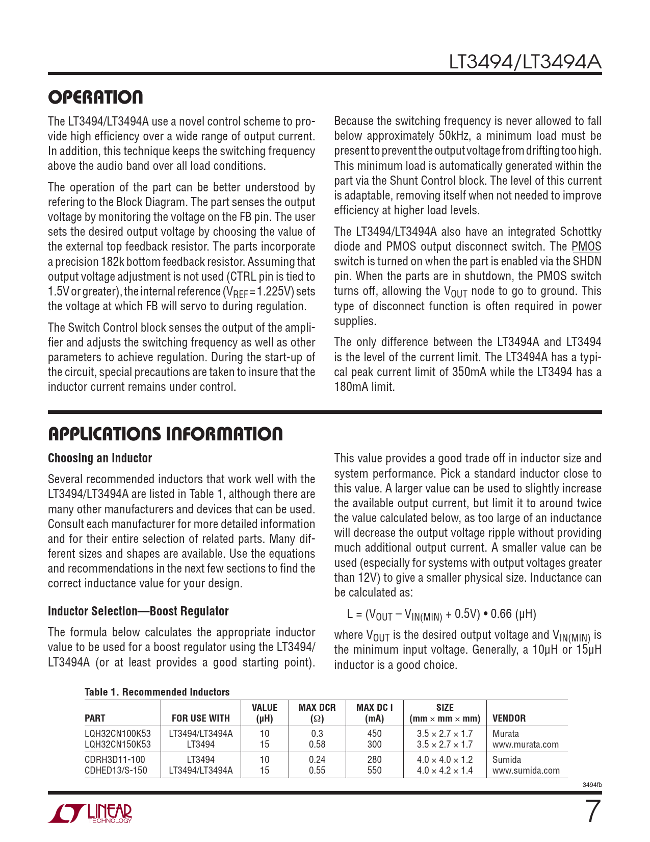 OPERATION. APPLICATIONS INFORMATION Choosing an Inductor. Inductor Selection—Boost Regulator. Table 1. Recommended Inductors