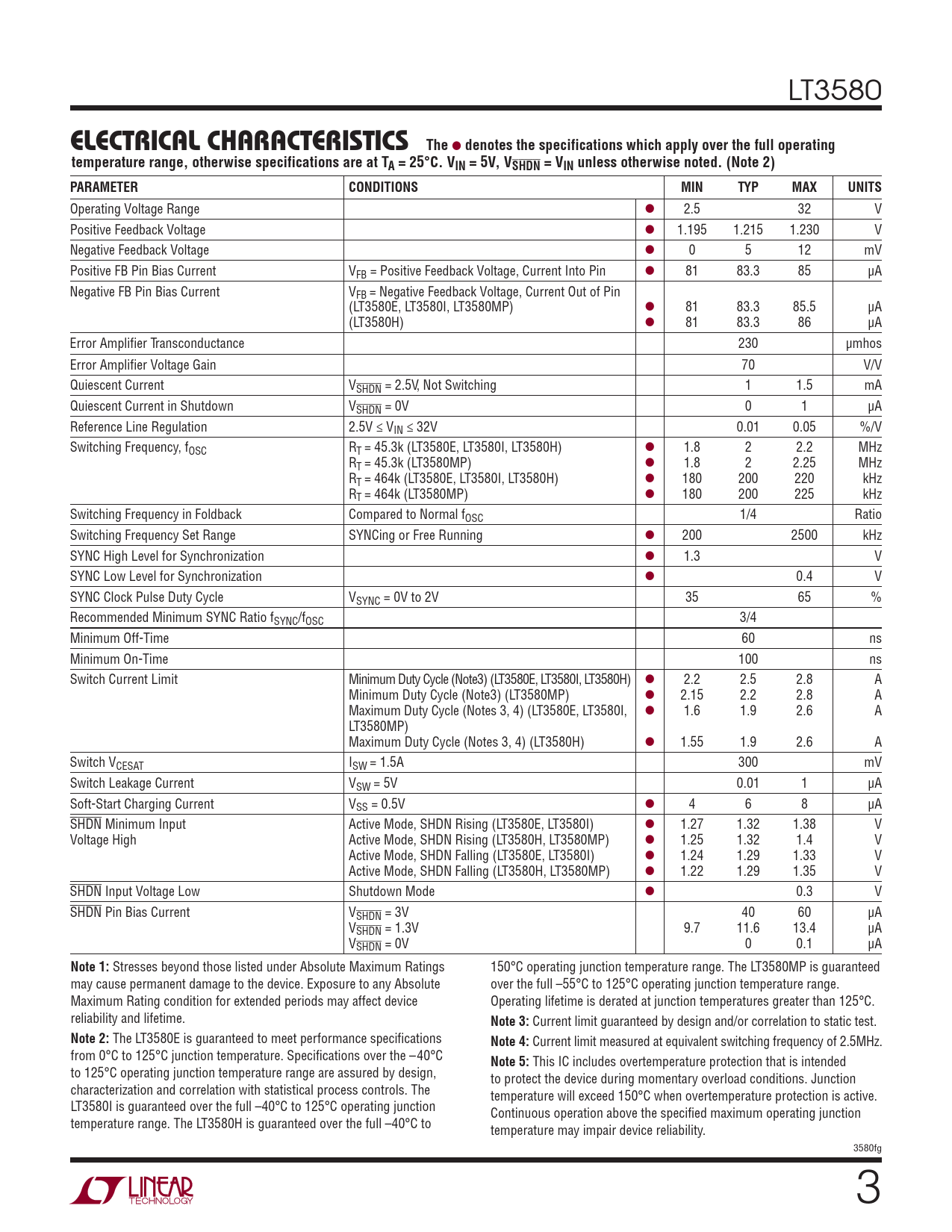 LT3580 ELECTRICAL CHARACTERISTICSThe l denotes the specifications which apply over the full operatingtemperature range, otherwise specifications are at TA = 25°C. VIN = 5V, VSHDN = VIN unless otherwise noted. (Note 2)PARAMETERCONDITIONSMINTYPMAXUNITS Operating Voltage Range l 2.5 32 V Positive Feedback Voltage l 1.195 1.215 1.230 V Negative Feedback Voltage l 0 5 12 mV Positive FB Pin Bias Current VFB = Positive Feedback Voltage, Current Into Pin l 81 83.3 85 μA Negative FB Pin Bias Current VFB = Negative Feedback Voltage, Current Out of Pin (LT3580E, LT3580I, LT3580MP) l 81 83.3 85.5 μA (LT3580H) l 81 83.3 86 μA Error Amplifier Transconductance 230 μmhos Error Amplifier Voltage Gain 70 V/V Quiescent Current VSHDN = 2.5V, Not Switching 1 1.5 mA Quiescent Current in Shutdown VSHDN = 0V 0 1 μA Reference Line Regulation 2.5V ≤ VIN ≤ 32V 0.01 0.05 %/V Switching Frequency, fOSC RT = 45.3k (LT3580E, LT3580I, LT3580H) l 1.8 2 2.2 MHz RT = 45.3k (LT3580MP) l 1.8 2 2.25 MHz RT = 464k (LT3580E, LT3580I, LT3580H) l 180 200 220 kHz RT = 464k (LT3580MP) l 180 200 225 kHz Switching Frequency in Foldback Compared to Normal fOSC 1/4 Ratio Switching Frequency Set Range SYNCing or Free Running l 200 2500 kHz SYNC High Level for Synchronization l 1.3 V SYNC Low Level for Synchronization l 0.4 V SYNC Clock Pulse Duty Cycle VSYNC = 0V to 2V 35 65 % Recommended Minimum SYNC Ratio fSYNC/fOSC 3/4 Minimum Off-Time 60 ns Minimum On-Time 100 ns Switch Current Limit Minimum Duty Cycle (Note3) (LT3580E, LT3580I, LT3580H) l 2.2 2.5 2.8 A Minimum Duty Cycle (Note3) (LT3580MP) l 2.15 2.2 2.8 A Maximum Duty Cycle (Notes 3, 4) (LT3580E, LT3580I, l 1.6 1.9 2.6 A LT3580MP) Maximum Duty Cycle (Notes 3, 4) (LT3580H) l 1.55 1.9 2.6 A Switch VCESAT ISW = 1.5A 300 mV Switch Leakage Current VSW = 5V 0.01 1 μA Soft-Start Charging Current VSS = 0.5V l 4 6 8 μA SHDN Minimum Input Active Mode, SHDN Rising (LT3580E, LT3580I) l 1.27 1.32 1.38 V Voltage High Active Mode, SHDN Rising (LT3580H, LT3580MP) l 1.25 1.32 1.4 V Active Mode, SHDN Falling (LT3580E, LT3580I) l 1.24 1.29 1.33 V Active Mode, SHDN Falling (LT3580H, LT3580MP) l 1.22 1.29 1.35 V SHDN Input Voltage Low Shutdown Mode l 0.3 V SHDN Pin Bias Current VSHDN = 3V 40 60 μA VSHDN = 1.3V 9.7 11.6 13.4 μA VSHDN = 0V 0 0.1 μA Note 1: Stresses beyond those listed under Absolute Maximum Ratings 150°C operating junction temperature range. The LT3580MP is guaranteed may cause permanent damage to the device. Exposure to any Absolute over the full –55°C to 125°C operating junction temperature range. Maximum Rating condition for extended periods may affect device Operating lifetime is derated at junction temperatures greater than 125°C. reliability and lifetime. Note 3: Current limit guaranteed by design and/or correlation to static test. Note 2: The LT3580E is guaranteed to meet performance specifications Note 4: Current limit measured at equivalent switching frequency of 2.5MHz. from 0°C to 125°C junction temperature. Specifications over the –40°C Note 5: This IC includes overtemperature protection that is intended to 125°C operating junction temperature range are assured by design, to protect the device during momentary overload conditions. Junction characterization and correlation with statistical process controls. The temperature will exceed 150°C when overtemperature protection is active. LT3580I is guaranteed over the full –40°C to 125°C operating junction Continuous operation above the specified maximum operating junction temperature range. The LT3580H is guaranteed over the full –40°C to temperature may impair device reliability. 3580fg 3