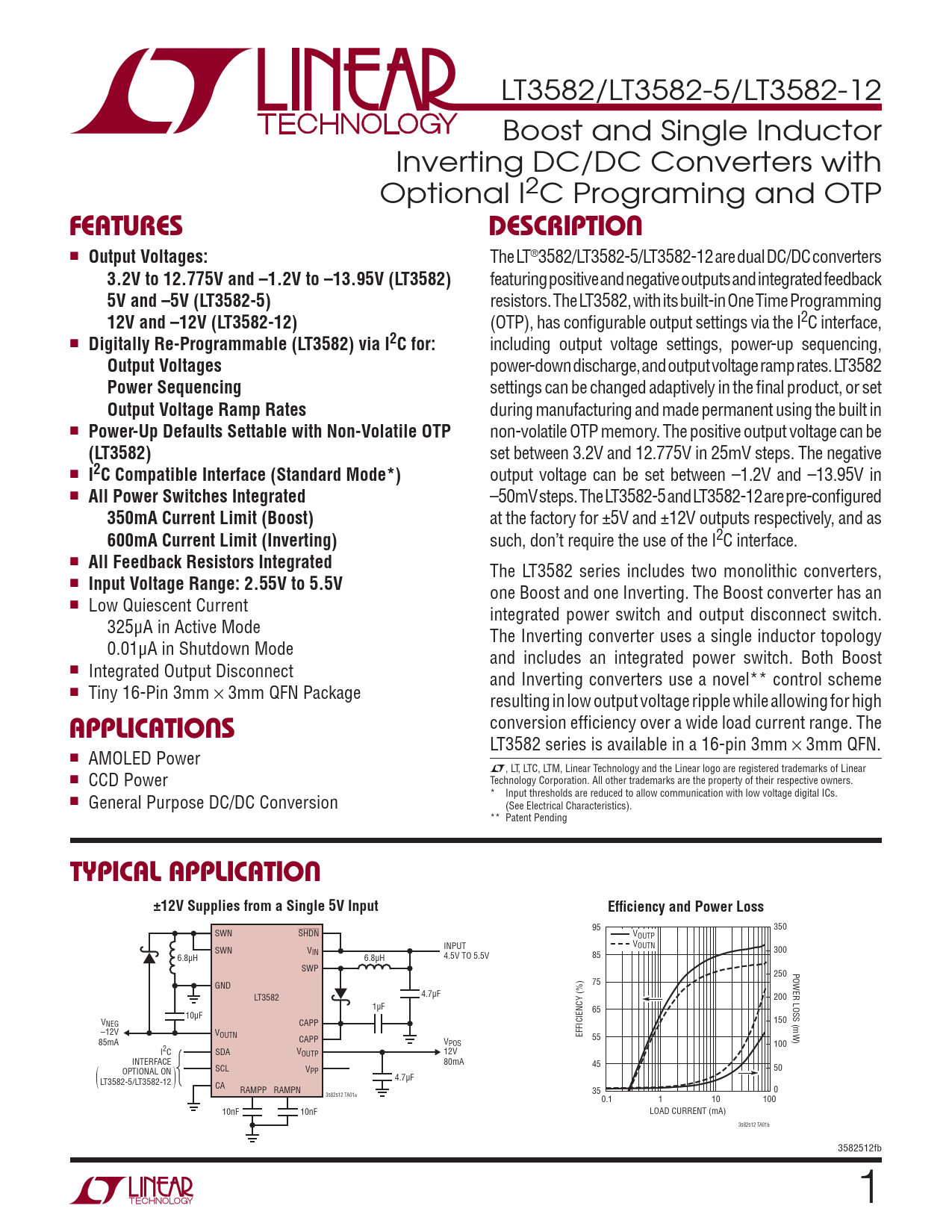 LT3582/LT3582-5/LT3582-12 Boost and Single Inductor Inverting DC/DC Converters with Optional I2C Programing and OTP FEATURESDESCRIPTION n Output Voltages: The LT®3582/LT3582-5/LT3582-12 are dual DC/DC converters 3.2V to 12.775V and –1.2V to –13.95V (LT3582) featuring positive and negative outputs and integrated feedback 5V and –5V (LT3582-5) resistors. The LT3582, with its built-in One Time Programming 12V and –12V (LT3582-12) (OTP), has confi gurable output settings via the I2C interface, n Digitally Re-Programmable (LT3582) via I2C for: including output voltage settings, power-up sequencing, OutputVoltages power-down discharge, and output voltage ramp rates. LT3582 PowerSequencing settings can be changed adaptively in the fi nal product, or set Output Voltage Ramp Rates during manufacturing and made permanent using the built in n Power-Up Defaults Settable with Non-Volatile OTP non-volatile OTP memory. The positive output voltage can be (LT3582) set between 3.2V and 12.775V in 25mV steps. The negative n I2C Compatible Interface (Standard Mode*) output voltage can be set between –1.2V and –13.95V in n All Power Switches Integrated –50mV steps. The LT3582-5 and LT3582-12 are pre-confi gured 350mA Current Limit (Boost) at the factory for ±5V and ±12V outputs respectively, and as 600mA Current Limit (Inverting) such, don’t require the use of the I2C interface. n All Feedback Resistors Integrated The LT3582 series includes two monolithic converters, n Input Voltage Range: 2.55V to 5.5V one Boost and one Inverting. The Boost converter has an n Low Quiescent Current integrated power switch and output disconnect switch. 325μA in Active Mode The Inverting converter uses a single inductor topology 0.01μA in Shutdown Mode and includes an integrated power switch. Both Boost n Integrated Output Disconnect and Inverting converters use a novel** control scheme n Tiny 16-Pin 3mm × 3mm QFN Package resulting in low output voltage ripple while allowing for high APPLICATIONS conversion effi ciency over a wide load current range. The LT3582 series is available in a 16-pin 3mm × 3mm QFN. n AMOLED Power L, LT, LTC, LTM, Linear Technology and the Linear logo are registered trademarks of Linear n CCD Power Technology Corporation. All other trademarks are the property of their respective owners. * Input thresholds are reduced to allow communication with low voltage digital ICs. n General Purpose DC/DC Conversion (See Electrical Characteristics). ** Patent Pending TYPICAL APPLICATION±12V Supplies from a Single 5V InputEffi ciency and Power Loss 95 350 SWN SHDN VOUTP INPUT VOUTN SWN VIN 300 4.5V TO 5.5V 6.8μH 6.8μH 85 SWP POWER LOSS (mW) 250 GND 75 LT3582 4.7μF 200 1μF 65 10μF V 150 NEG CAPP –12V VOUTN EFFICIENCY (%) CAPP 55 85mA VPOS 100 I2C SDA VOUTP 12V INTERFACE 80mA 45 SCL V OPTIONAL ON PP 50 4.7μF LT3582-5/LT3582-12 CA RAMPP RAMPN 35 0 3582512 TA01a 0.1 1 10 100 10nF 10nF LOAD CURRENT (mA) 3582512 TA01b 3582512fb 1