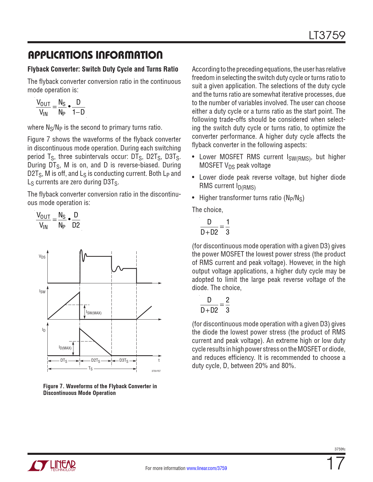 LT3759 APPLICATIONS INFORMATIONFlyback Converter: Switch Duty Cycle and Turns Ratio According to the preceding equations, the user has relative The flyback converter conversion ratio in the continuous freedom in selecting the switch duty cycle or turns ratio to mode operation is: suit a given application. The selections of the duty cycle and the turns ratio are somewhat iterative processes, due VOUT = NS • D to the number of variables involved. The user can choose VIN NP 1−D either a duty cycle or a turns ratio as the start point. The following trade-offs should be considered when select- where NS/NP is the second to primary turns ratio. ing the switch duty cycle or turns ratio, to optimize the Figure 7 shows the waveforms of the flyback converter converter performance. A higher duty cycle affects the in discontinuous mode operation. During each switching flyback converter in the following aspects: period TS, three subintervals occur: DTS, D2TS, D3TS. • Lower MOSFET RMS current ISW(RMS), but higher During DTS, M is on, and D is reverse-biased. During MOSFET VDS peak voltage D2TS, M is off, and LS is conducting current. Both LP and • Lower diode peak reverse voltage, but higher diode LS currents are zero during D3TS. RMS current ID(RMS) The flyback converter conversion ratio in the discontinu- • Higher transformer turns ratio (N ous mode operation is: P/NS) The choice, VOUT = NS • D D VIN NP D2 = 1 D+D2 3 (for discontinuous mode operation with a given D3) gives V the power MOSFET the lowest power stress (the product DS of RMS current and peak voltage). However, in the high output voltage applications, a higher duty cycle may be adopted to limit the large peak reverse voltage of the diode. The choice, ISW D = 2 ISW(MAX) D+D2 3 (for discontinuous mode operation with a given D3) gives ID the diode the lowest power stress (the product of RMS current and peak voltage). An extreme high or low duty ID(MAX) cycle results in high power stress on the MOSFET or diode, and reduces efficiency. It is recommended to choose a DTS D2TS D3TS t T duty cycle, D, between 20% and 80%. S 3759 F07 Figure 7. Waveforms of the Flyback Converter inDiscontinuous Mode Operation 3759fc For more information www.linear.com/3759 17 Document Outline Features Applications Description Typical Application Absolute Maximum Ratings Pin Configuration Order Information Electrical Characteristics Typical Performance Characteristics Pin Functions Block Diagram Applications Information Typical Applications Package Description Revision History Related Parts