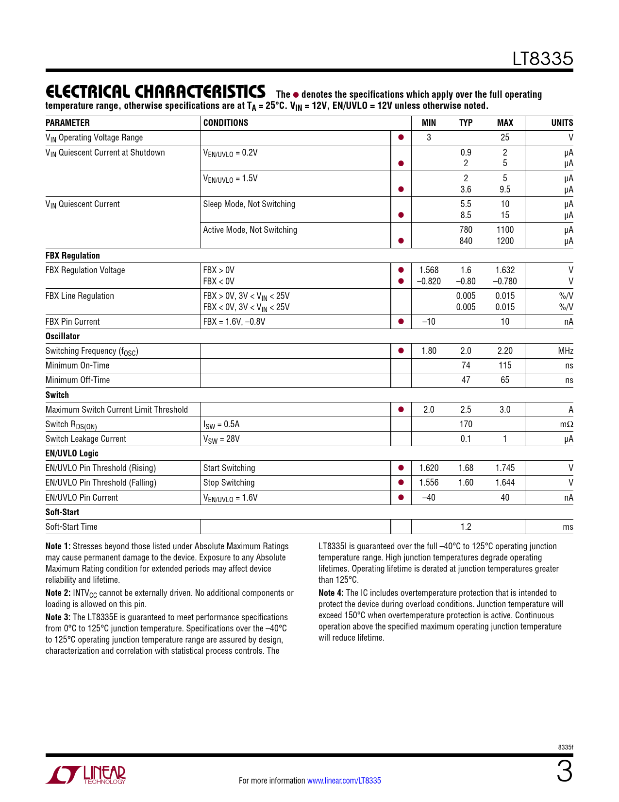 LT8335 ELECTRICAL CHARACTERISTICSThe l denotes the specifications which apply over the full operatingtemperature range, otherwise specifications are at TA = 25°C. VIN = 12V, EN/UVLO = 12V unless otherwise noted. PARAMETERCONDITIONSMINTYPMAXUNITS VIN Operating Voltage Range l 3 25 V VIN Quiescent Current at Shutdown VEN/UVLO = 0.2V 0.9 2 µA l 2 5 µA VEN/UVLO = 1.5V 2 5 µA l 3.6 9.5 µA VIN Quiescent Current Sleep Mode, Not Switching 5.5 10 µA l 8.5 15 µA Active Mode, Not Switching 780 1100 µA l 840 1200 µA FBX Regulation FBX Regulation Voltage FBX > 0V l 1.568 1.6 1.632 V FBX < 0V l –0.820 –0.80 –0.780 V FBX Line Regulation FBX > 0V, 3V < VIN < 25V 0.005 0.015 %/V FBX < 0V, 3V < VIN < 25V 0.005 0.015 %/V FBX Pin Current FBX = 1.6V, –0.8V l –10 10 nA Oscillator Switching Frequency (fOSC) l 1.80 2.0 2.20 MHz Minimum On-Time 74 115 ns Minimum Off-Time 47 65 ns Switch Maximum Switch Current Limit Threshold l 2.0 2.5 3.0 A Switch RDS(ON) ISW = 0.5A 170 mΩ Switch Leakage Current VSW = 28V 0.1 1 µA EN/UVLO Logic EN/UVLO Pin Threshold (Rising) Start Switching l 1.620 1.68 1.745 V EN/UVLO Pin Threshold (Falling) Stop Switching l 1.556 1.60 1.644 V EN/UVLO Pin Current VEN/UVLO = 1.6V l –40 40 nA Soft-Start Soft-Start Time 1.2 ms Note 1: Stresses beyond those listed under Absolute Maximum Ratings LT8335I is guaranteed over the full –40°C to 125°C operating junction may cause permanent damage to the device. Exposure to any Absolute temperature range. High junction temperatures degrade operating Maximum Rating condition for extended periods may affect device lifetimes. Operating lifetime is derated at junction temperatures greater reliability and lifetime. than 125°C. Note 2: INTVCC cannot be externally driven. No additional components or Note 4: The IC includes overtemperature protection that is intended to loading is allowed on this pin. protect the device during overload conditions. Junction temperature will Note 3: The LT8335E is guaranteed to meet performance specifications exceed 150°C when overtemperature protection is active. Continuous from 0°C to 125°C junction temperature. Specifications over the –40°C operation above the specified maximum operating junction temperature to 125°C operating junction temperature range are assured by design, will reduce lifetime. characterization and correlation with statistical process controls. The 8335f For more information www.linear.com/LT8335 3