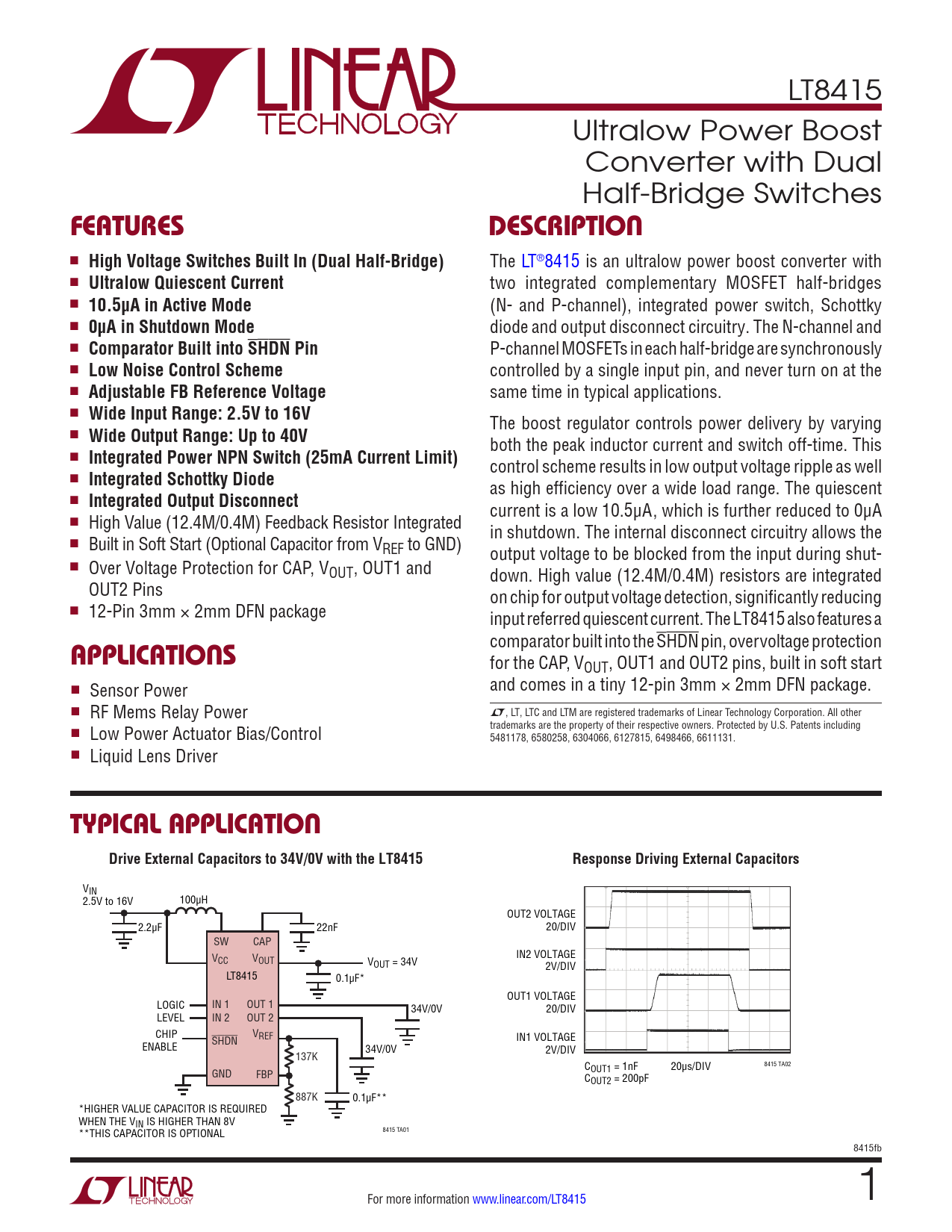 LT8415 Ultralow Power Boost Converter with Dual Half-Bridge Switches FEATURESDESCRIPTION n High Voltage Switches Built In (Dual Half-Bridge) The LT®8415 is an ultralow power boost converter with n Ultralow Quiescent Current two integrated complementary MOSFET half-bridges n 10.5μA in Active Mode (N- and P-channel), integrated power switch, Schottky n 0μA in Shutdown Mode diode and output disconnect circuitry. The N-channel and n Comparator Built into SHDN Pin P-channel MOSFETs in each half-bridge are synchronously n Low Noise Control Scheme controlled by a single input pin, and never turn on at the n Adjustable FB Reference Voltage same time in typical applications. n Wide Input Range: 2.5V to 16V The boost regulator controls power delivery by varying n Wide Output Range: Up to 40V both the peak inductor current and switch off-time. This n Integrated Power NPN Switch (25mA Current Limit) control scheme results in low output voltage ripple as well n Integrated Schottky Diode as high efficiency over a wide load range. The quiescent n Integrated Output Disconnect current is a low 10.5μA, which is further reduced to 0μA n High Value (12.4M/0.4M) Feedback Resistor Integrated in shutdown. The internal disconnect circuitry allows the n Built in Soft Start (Optional Capacitor from VREF to GND) output voltage to be blocked from the input during shut- n Over Voltage Protection for CAP, VOUT, OUT1 and down. High value (12.4M/0.4M) resistors are integrated OUT2 Pins on chip for output voltage detection, significantly reducing n 12-Pin 3mm × 2mm DFN package input referred quiescent current. The LT8415 also features a comparator built into the SHDN pin, overvoltage protection APPLICATIONS for the CAP, VOUT, OUT1 and OUT2 pins, built in soft start n and comes in a tiny 12-pin 3mm × 2mm DFN package. Sensor Power n L RF Mems Relay Power , LT, LTC and LTM are registered trademarks of Linear Technology Corporation. All other trademarks are the property of their respective owners. Protected by U.S. Patents including n Low Power Actuator Bias/Control 5481178, 6580258, 6304066, 6127815, 6498466, 6611131. n Liquid Lens Driver TYPICAL APPLICATIONDrive External Capacitors to 34V/0V with the LT8415Response Driving External Capacitors VIN 2.5V to 16V 100µH OUT2 VOLTAGE 2.2µF 22nF 20/DIV SW CAP V IN2 VOLTAGE CC VOUT VOUT = 34V 2V/DIV LT8415 0.1µF* OUT1 VOLTAGE LOGIC IN 1 OUT 1 34V/0V 20/DIV LEVEL IN 2 OUT 2 CHIP VREF IN1 VOLTAGE ENABLE SHDN 34V/0V 2V/DIV 137K C 20µs/DIV 8415 TA02 GND FBP OUT1 = 1nF COUT2 = 200pF 887K 0.1µF** *HIGHER VALUE CAPACITOR IS REQUIRED WHEN THE VIN IS HIGHER THAN 8V 8415 TA01 **THIS CAPACITOR IS OPTIONAL 8415fb For more information www.linear.com/LT8415 1