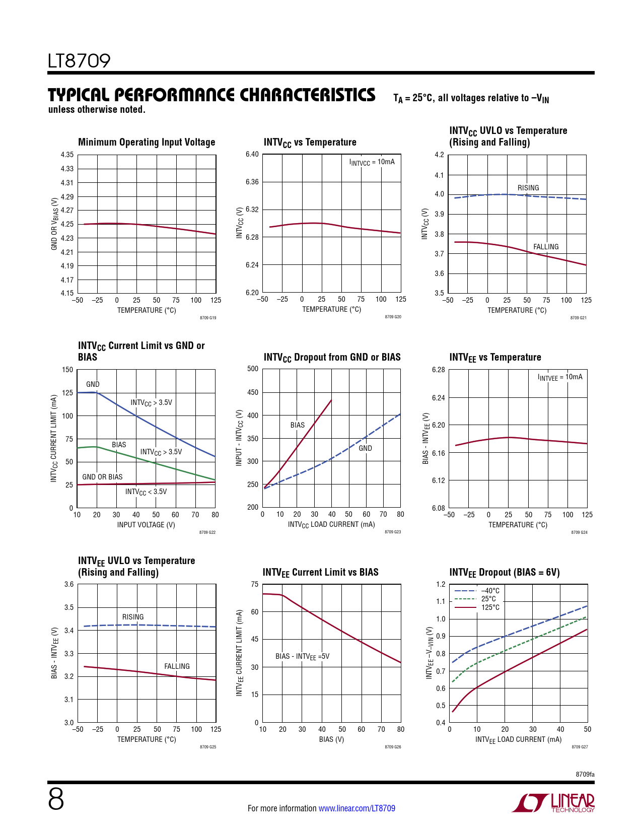 TYPICAL PERFORMANCE CHARACTERISTICS TA = 25°C, all voltages relative to –VIN unless otherwise noted. INTVCC UVLO vs Temperature Minimum Operating Input Voltage INTVCC vs Temperature (Rising and Falling)
