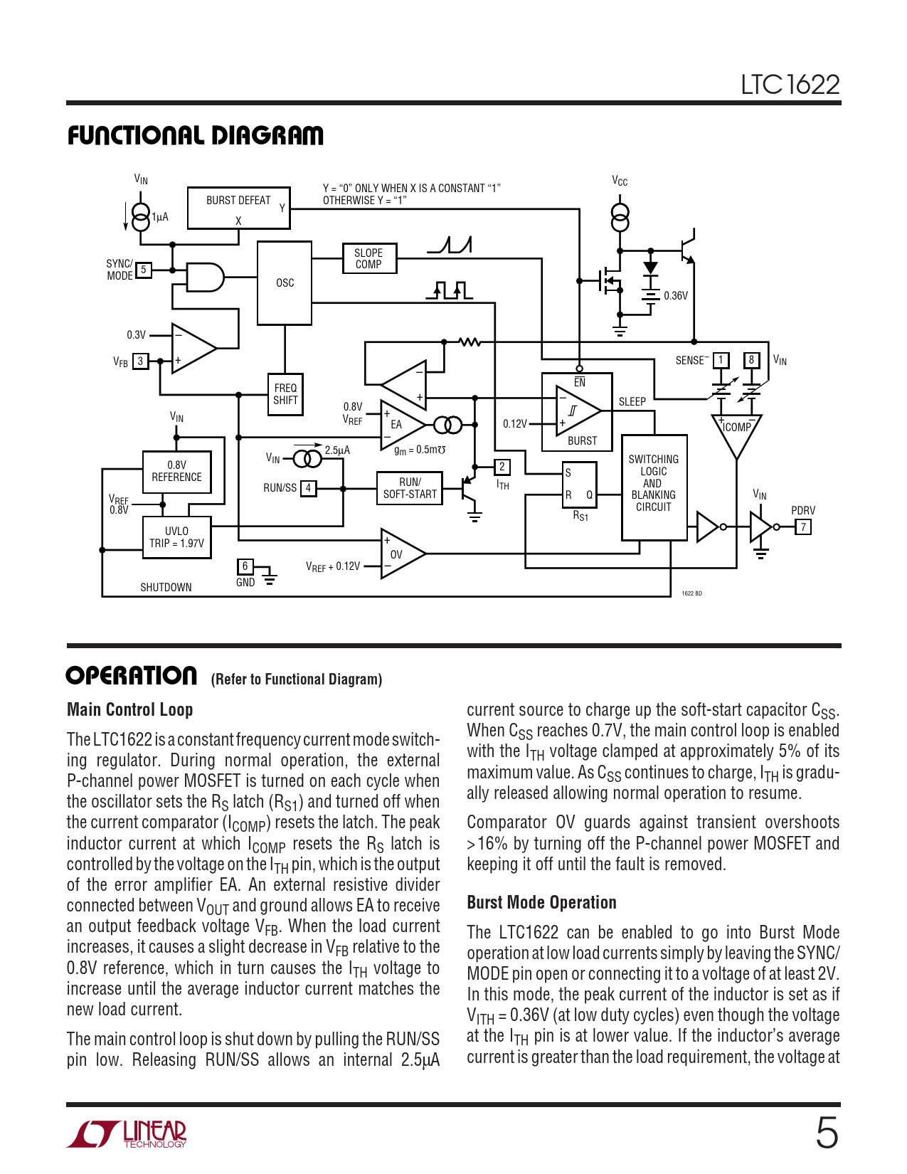VIN VCC Y = “0” ONLY WHEN X IS A CONSTANT “1” BURST DEFEAT OTHERWISE Y = “1” Y 1µA X SLOPE SYNC/ COMP 5 MODE OSC 0.36V 0.3V – V 3 + SENSE– 1 8 V FB IN – EN FREQ + SHIFT – SLEEP 0.8V + VIN VREF EA 0.12V + + – ICOMP – Ω BURST 2.5µA gm = 0.5m VIN SWITCHING 0.8V 2 S LOGIC REFERENCE RUN/ RUN/SS 4 I AND TH SOFT-START R Q V V BLANKING IN REF 0.8V CIRCUIT R PDRV S1 7 UVLO + TRIP = 1.97V OV 6 VREF + 0.12V – GND SHUTDOWN 1622 BD
