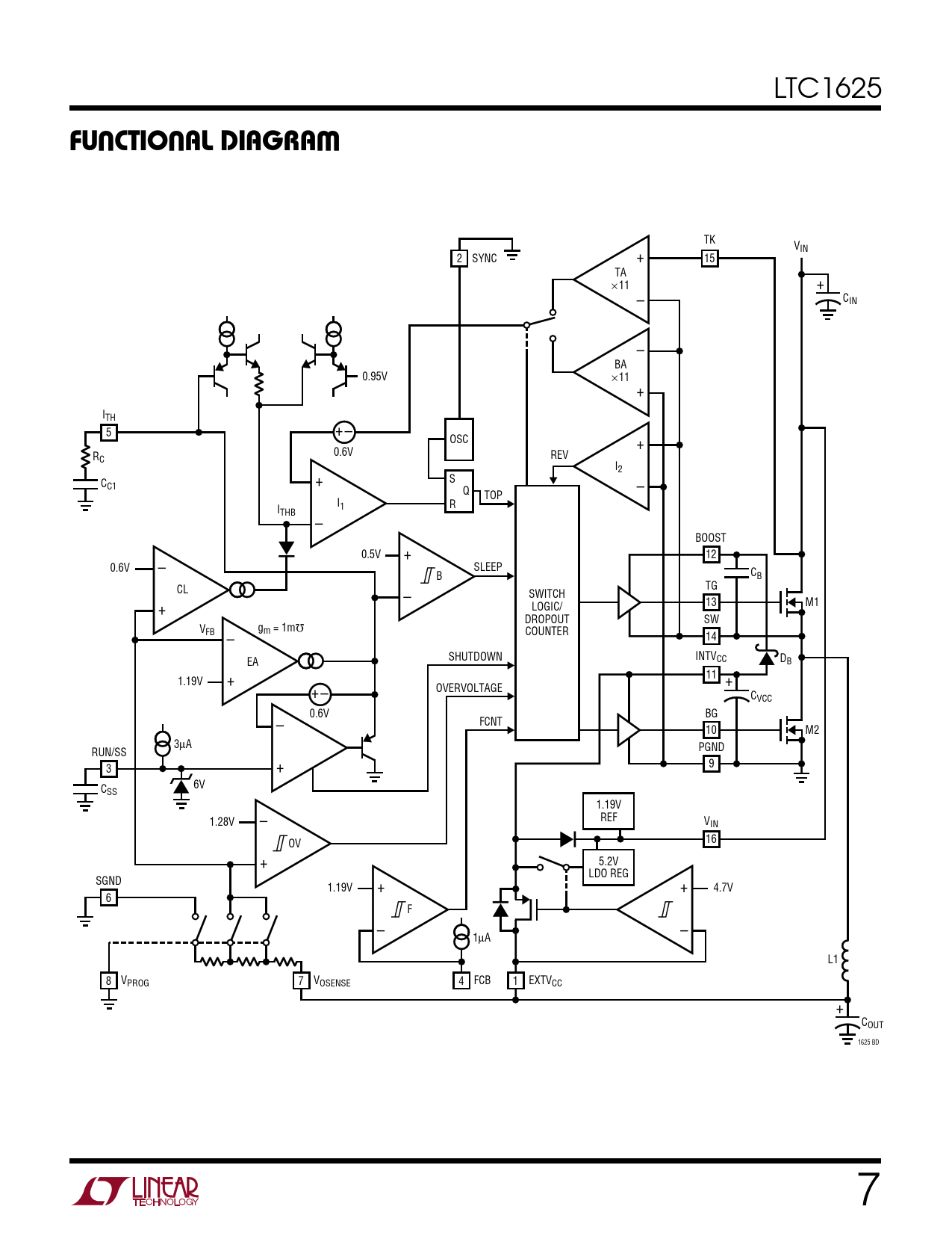 TK VIN 2 SYNC + 15 TA ×11 + C – IN – BA 0.95V ×11 + ITH 5 + – OSC + 0.6V R REV C I2 + C S C1 Q – TOP I I 1 R THB – BOOST + 0.5V 12 – 0.6V SLEEP C B B TG CL – SWITCH + 13 M1 LOGIC/ Ω DROPOUT SW V g FB – m = 1m COUNTER 14 SHUTDOWN INTVCC D EA B + 11 1.19V + OVERVOLTAGE + – CVCC 0.6V BG – FCNT 10 M2 3µA RUN/SS PGND + 9 3 C 6V SS 1.19V – REF 1.28V VIN 16 OV + 5.2V LDO REG SGND 1.19V + + 4.7V 6 F – – 1µA L1 8 VPROG 7 VOSENSE 4 FCB 1 EXTVCC + COUT 1625 BD 7