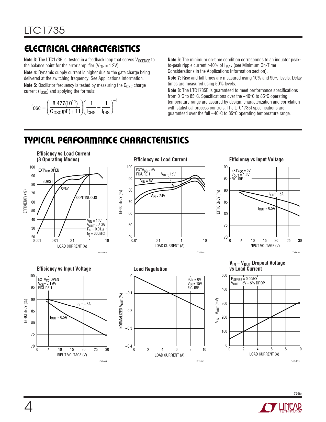 The LTC1735E is guaranteed to meet performance specifications OSC) and applying the formula: from 0°C to 85°C. Specifications over the –40°C to 85°C operating  1 – 8.477 1011 ( )   1 1  temperature range are assured by design, characterization and correlation fOSC = with statistical process controls. The LTC1735I specifications are  C p ( F) +  + 11  I I OSC CHG DIS   guaranteed over the full –40°C to 85°C operating temperature range.