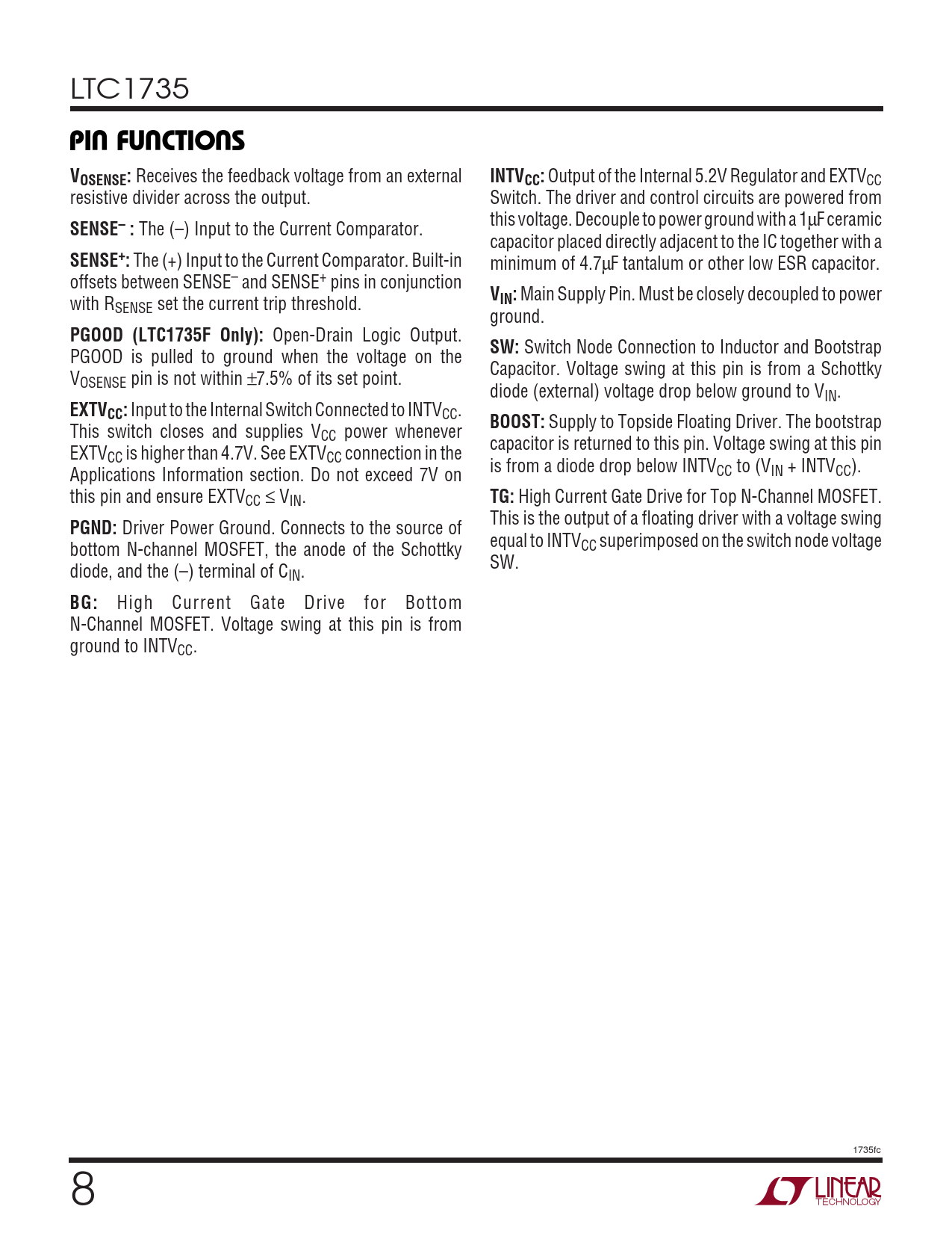 PI FU CTIO S. VOSENSE:. INTVCC:. SENSE– :. SENSE+:. IN:. PGOOD (LTC1735F Only):. SW:. EXTVCC:. BOOST:. TG:. PGND:. BG: