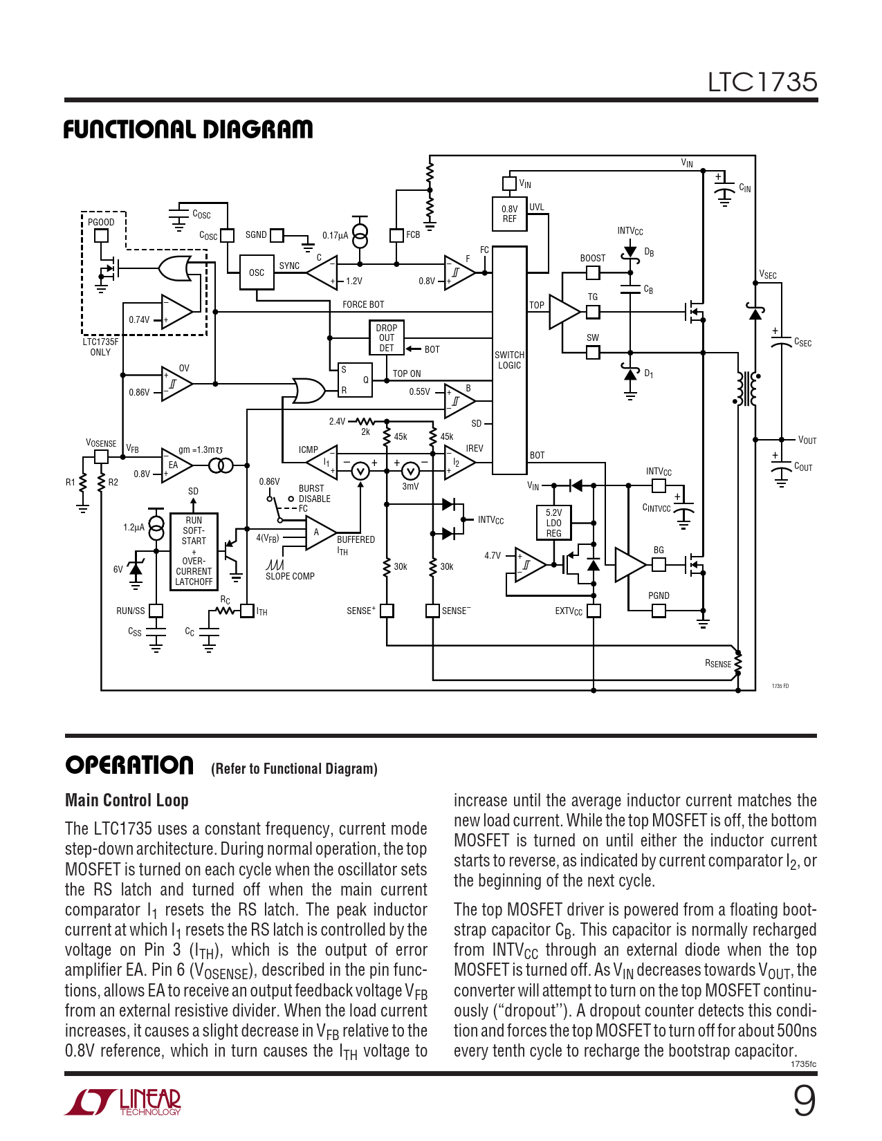 LTC1735 UUWFU CTIO AL DIAGRA VIN + VIN CIN 0.8V UVL COSC REF PGOOD INTV C SGND 0.17 OSC µA CC FCB FC DB C F BOOST – – SYNC OSC VSEC + 1.2V 0.8V + CB TG – FORCE BOT TOP 0.74V + DROP + OUT SW LTC1735F CSEC DET BOT ONLY SWITCH OV LOGIC S + TOP ON D1 Q 0.86V – R 0.55V + B – 2.4V SD 2k 45k 45k V V OSENSE OUT Ω VFB gm =1.3m ICMP IREV – – – BOT + I EA 1 – + + – I2 + COUT 0.8V + + INTVCC R1 R2 0.86V BURST 3mV V SD IN DISABLE + FC C 5.2V INTVCC RUN INTVCC LDO 1.2µA SOFT- A REG START 4(VFB) BUFFERED + ITH BG 4.7V + OVER- 6V 30k 30k CURRENT – SLOPE COMP LATCHOFF R PGND C RUN/SS ITH SENSE+ SENSE– EXTVCC CSS CC RSENSE 1735 FD UOPERATIO(Refer to Functional Diagram)Main Control Loop increase until the average inductor current matches the new load current. While the top MOSFET is off, the bottom The LTC1735 uses a constant frequency, current mode MOSFET is turned on until either the inductor current step-down architecture. During normal operation, the top starts to reverse, as indicated by current comparator I MOSFET is turned on each cycle when the oscillator sets 2, or the beginning of the next cycle. the RS latch and turned off when the main current comparator I1 resets the RS latch. The peak inductor The top MOSFET driver is powered from a floating boot- current at which I1 resets the RS latch is controlled by the strap capacitor CB. This capacitor is normally recharged voltage on Pin 3 (ITH), which is the output of error from INTVCC through an external diode when the top amplifier EA. Pin␣ 6 (VOSENSE), described in the pin func- MOSFET is turned off. As VIN decreases towards VOUT, the tions, allows EA to receive an output feedback voltage VFB converter will attempt to turn on the top MOSFET continu- from an external resistive divider. When the load current ously (“dropout’’). A dropout counter detects this condi- increases, it causes a slight decrease in VFB relative to the tion and forces the top MOSFET to turn off for about 500ns 0.8V reference, which in turn causes the ITH voltage to every tenth cycle to recharge the bootstrap capacitor. 1735fc 9